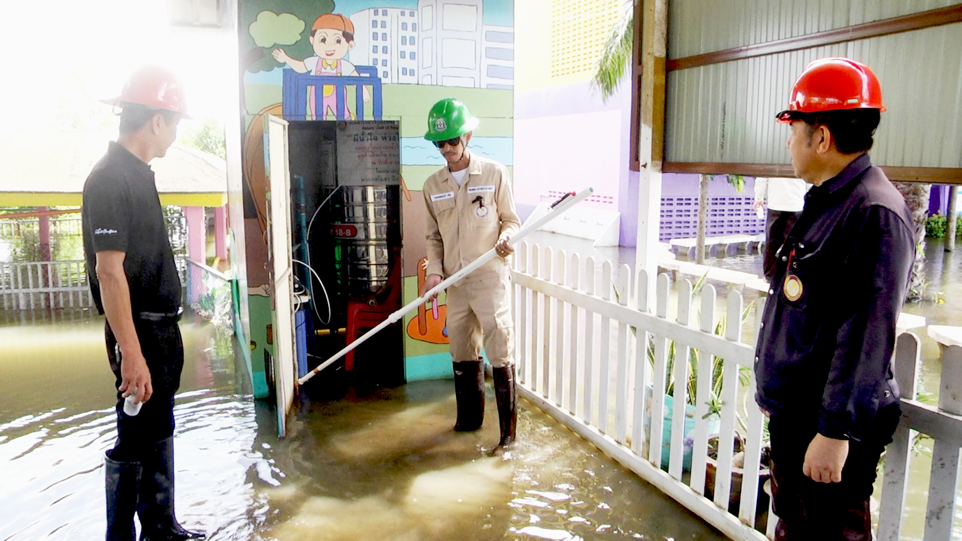 นายสาโรจน์ แช่มช้อย ผู้จัดการการไฟฟ้าส่วนภูมิภาคจังหวัดสุพรรณบุรี พร้อมด้วย นายเมธี สุกก่ำ รองผู้อำนวยการฝ่ายวิศวกรรมและบริการ การไฟฟ้าส่วนภูมิภาค เขต 3 (ภาคกลาง) จังหวัดนครปฐม รองผู้อำนวยการฝ่ายวิศวกรรมและบริการ นายเมธี สุกก่ำ การไฟฟ้าส่วนภูมิภาค เขต 3 ภาคกลาง จังหวัดนครปฐม นายอารุณ จรดล ผู้จัดการ การไฟฟ้าส่วนภูมิภาคสาขาอู่ทอง นายประเสริฐ ฝัดศิริ ผู้จัดการ การไฟฟ้าส่วนภูมิภาคสาขาสองพี่น้อง นายพรหมแดน สิทธิงาม ผู้จัดการ การไฟฟ้าส่วนภูมิภาคสาขาทุ่งคอก นายมนตรี พุทธโอวาท ปลัดองค์การบริหารส่วนตำบล บางตะเคียน และพนักงานในสังกัดลงพื้นที่ตรวจสอบจุดเสี่ยงที่อาจจะเกิดอันตรายจากกระแสไฟฟ้ารั่ว ที่โรงเรียนวัดสำเภาทอง ตำบลบางตะเคียน อำเภอสองพี่น้อง ที่ถูกน้ำท่วมขัง โดยทางโรงเรียนยังคงเปิดสอนตามปกติ เนื่องจากทางท้องถิ่น ได้นำกระสอบทรายมาวางทำแนวกั้นพื้นที่ตัวอาคารเรียนให้นักเรียนสามารถมาเรียนได้ตามปกติ ส่วนพื้นที่ด้านนอกแนวกั้นถูกน้ำท่วมรวมทั้งสนามหน้าโรงเรียน ห้องน้ำ เครื่องผลิตน้ำดื่มของทางโรงเรียนก็ถูกน้ำท่วมพื้น แต่ยังสามารถใช้การได้ จากการตรวจสอบอุปกรณ์เครื่องใช้ไฟฟ้าต่างๆของทางโรงเรียนพบว่ามีความสมบูรณ์ไม่มีกระแสไฟฟ้ารั่วไหล แต่อย่างใด