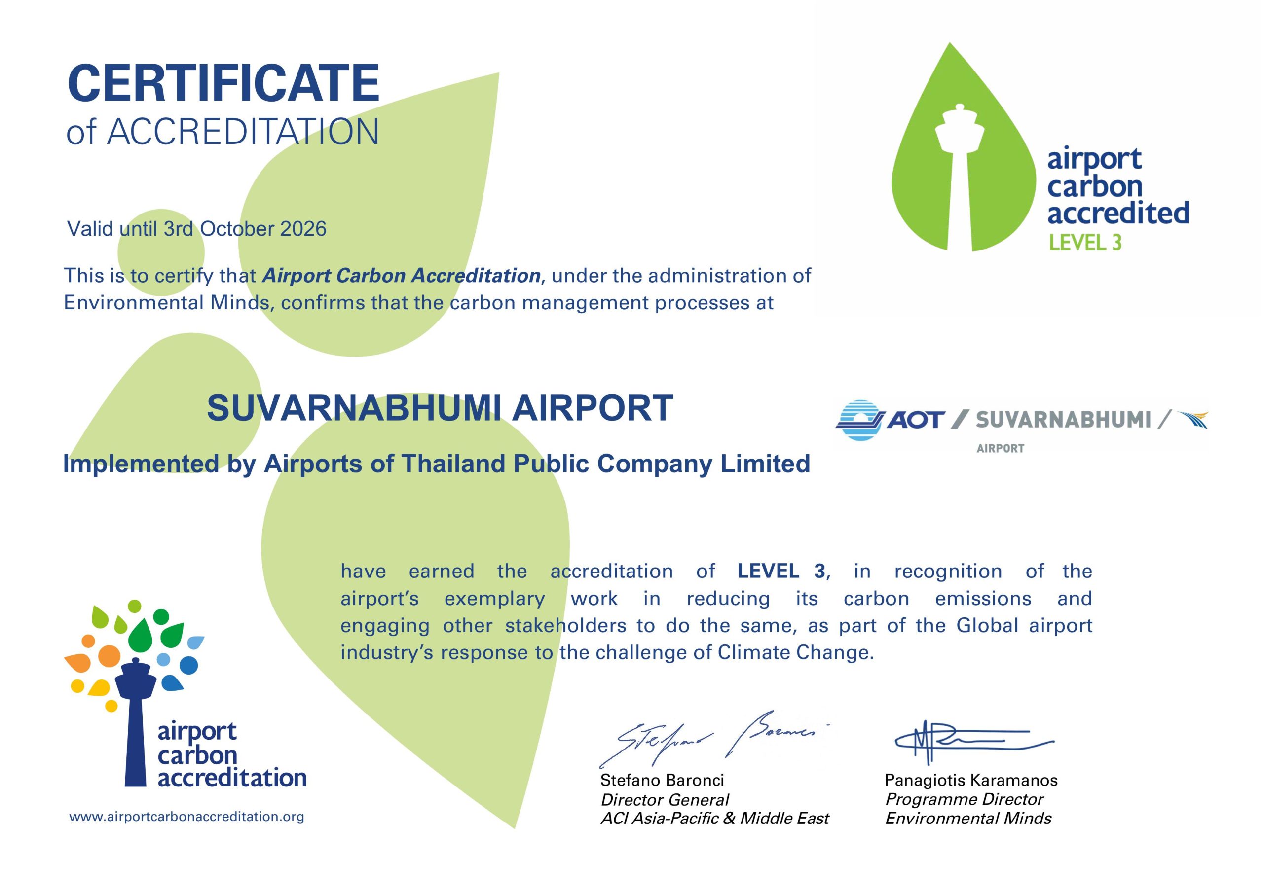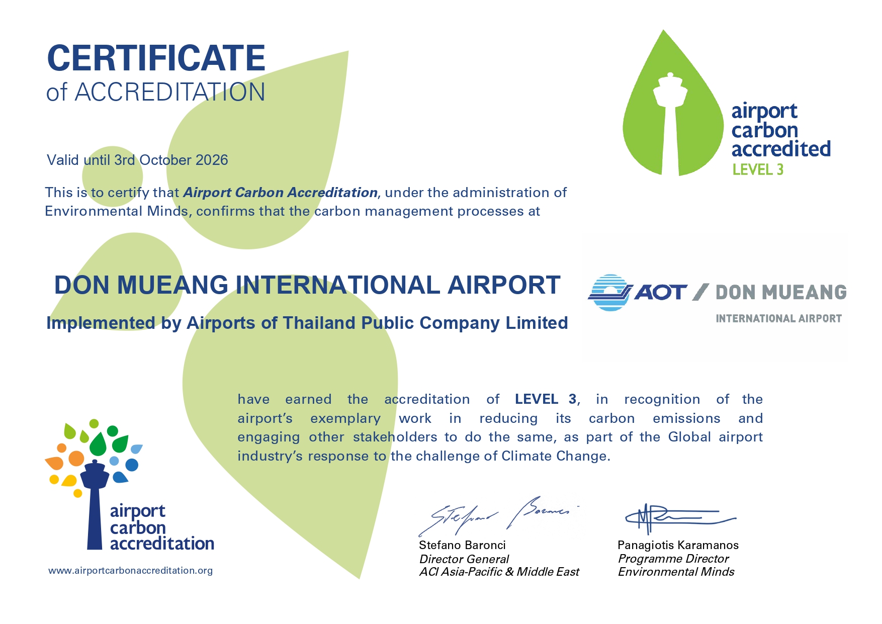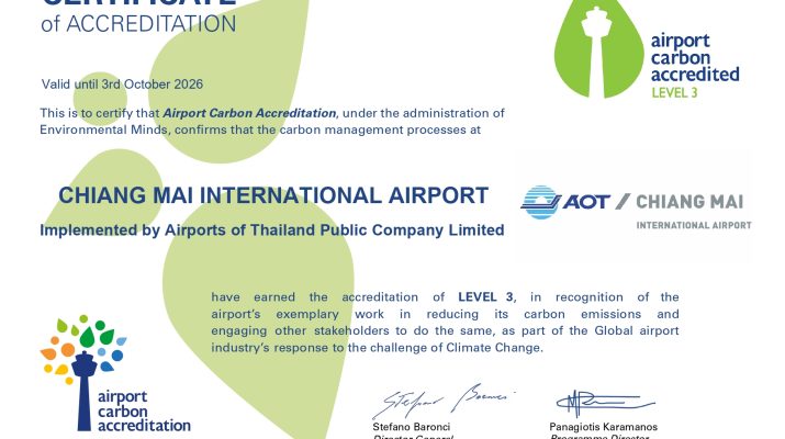*****บริษัท ท่าอากาศยานไทย จำกัด (มหาชน) (AOT) เดินหน้ารักษามาตรฐานความยั่งยืนด้านสิ่งแวดล้อมอย่างต่อเนื่อง โดยท่าอากาศยานสุวรรณภูมิ (ทสภ.) ท่าอากาศยานดอนเมือง (ทดม.) ท่าอากาศยานเชียงใหม่ (ทชม.) ท่าอากาศยานแม่ฟ้าหลวง เชียงราย (ทชร.) และท่าอากาศยานหาดใหญ่ (ทหญ.) ได้รับการรับรองตามโปรแกรม Airport Carbon Accreditation (ACA) ของ Airports Council International (ACI) ในระดับที่ 3 Optimisation ท่าอากาศยานภูเก็ต (ทภก.) ได้รับการรับรองในระดับที่ 2 Reduction