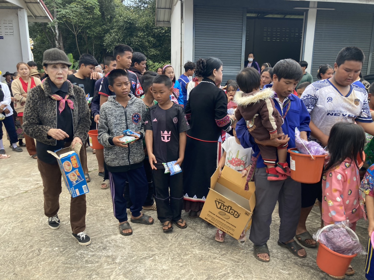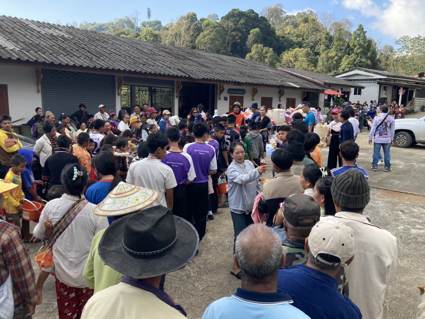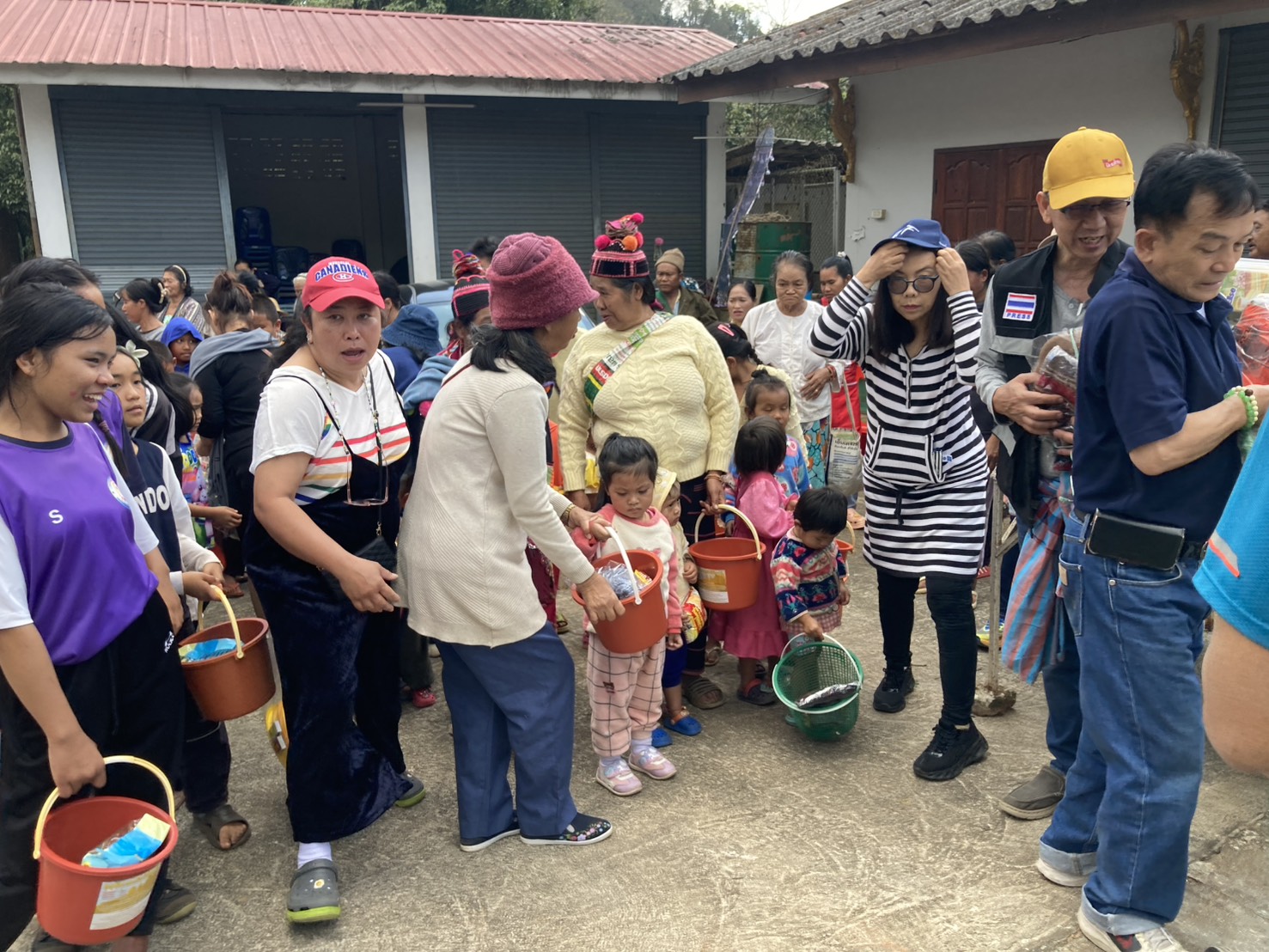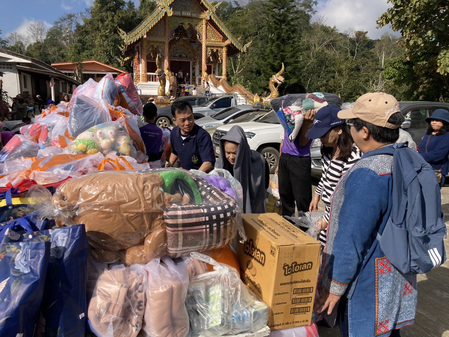 พร้อมทั้งผ้าห่มอีกจำนวนกว่า 300 ผืนให้กับชาวบ้านที่ยังขาดแคลนในช่วงฤดูหนาวเพราะบนดอยจะมีอุณหภูมิที่หนาวเย็นกว่าพื้นราบทั่วไปถึง5-8 องศา มีอุปกรณ์รักษาพยาบาลยาสามัญประจำบ้านทั่วไปให้กับประชาชน พร้อมทั้งขนมซองสำหรับเด็กๆ เพื่อเป็นการส่งท้ายปีเก่าต้อนรับปีใหม่ มีประชาชน 4 หย่อมบ้านที่เดินทางมารับโดยทางคณะได้ส่งมอบให้กับผู้ใหญ่บ้านพร้อมคณะกรรมการหมู่บ้านได้ร่วมแจกจ่ายแก่ประชาชนที่ขาดแคลนตามความจำเป็นที่ทางผู้ใหญ่บ้านได้คัดเลือกที่ยากจนมากก่อน