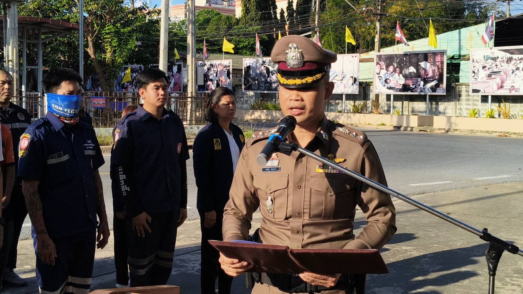โดยมี พันตำรวจเอก สาธิต สอนซา ผู้กำกับการสถานีตำรวจภูธรค่ายบางระจัน กล่าวรายงานวัตถุประสงค์ของการจัดพิธีในครั้งนี้ พร้อมด้วยผู้แทนจากตำรวจภูธรจังหวัดสิงห์บุรี ตำรวจทางหลวง เจ้าหน้าที่ทหาร ฝ่ายปกครอง องค์กรปกครองส่วนท้องถิ่น และอาสาสมัครภาคประชาชน เข้าร่วมพิธีอย่างพร้อมเพรียง