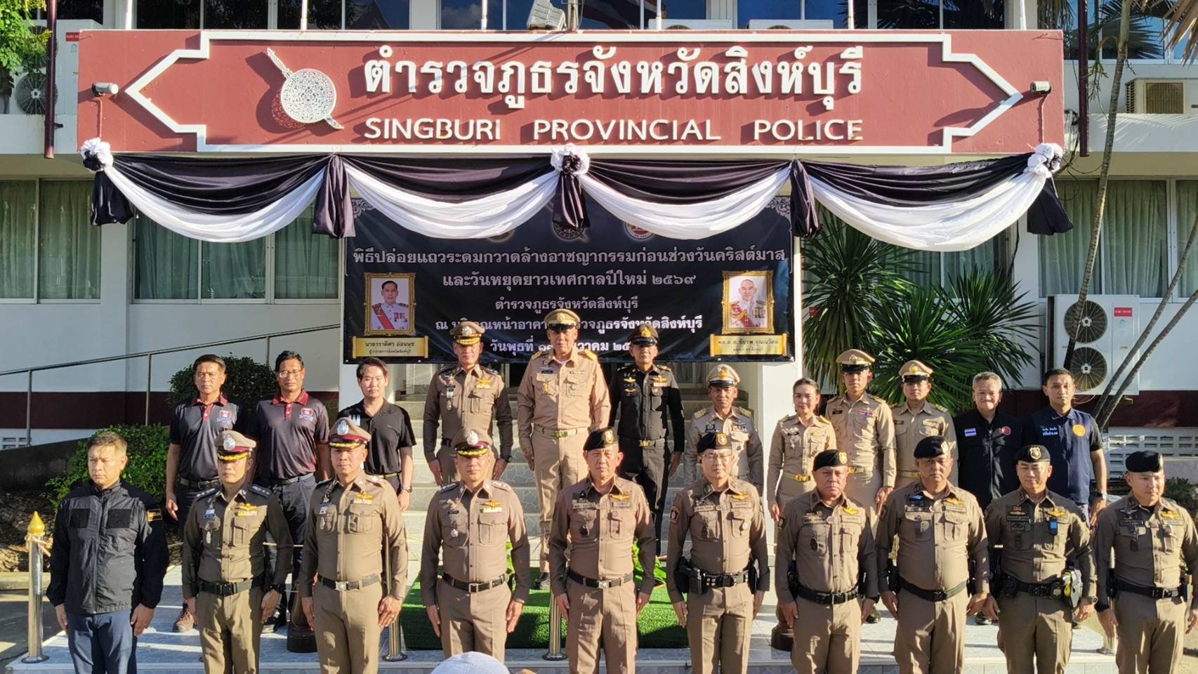 วันพุธที่ 17 ธันวาคม 2568 เวลา 16.00 น. ณ บริเวณหน้าอาคารตำรวจภูธรจังหวัดสิงห์บุรี นายวราดิศร อ่อนนุช ผู้ว่าราชการจังหวัดสิงห์บุรี ให้เกียรติเป็นประธานในพิธีปล่อยแถวระดมกวาดล้างอาชญากรรม ก่อนช่วงวันคริสต์มาสและวันหยุดยาวเทศกาลปีใหม่ 2569 เพื่อเสริมสร้างความปลอดภัยในชีวิตและทรัพย์สินของประชาชน รวมถึงรักษาความสงบเรียบร้อยในพื้นที่จังหวัดสิงห์บุรี