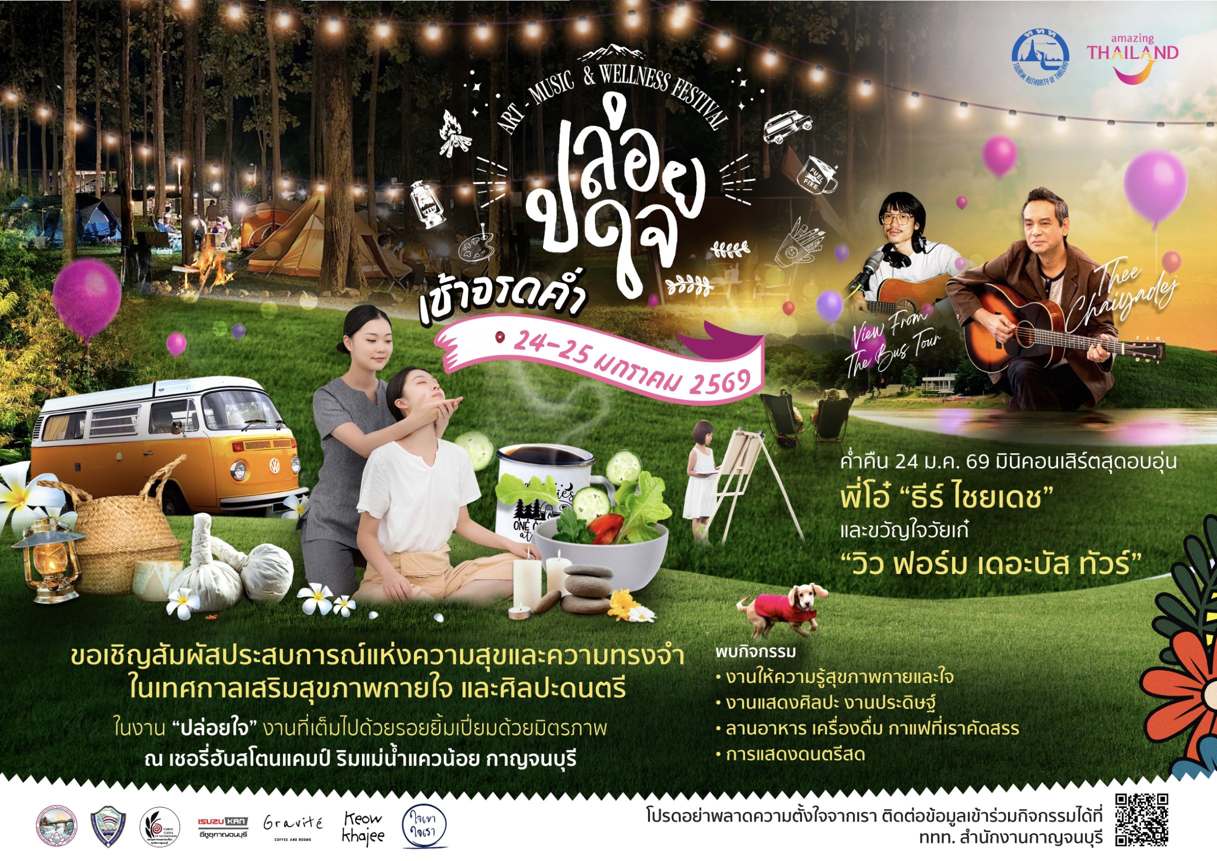 การท่องเที่ยวแห่งประเทศไทย (ททท.) สำนักงานกาญจนบุรี จับมือพันธมิตรทั้งภาครัฐและเอกชน ได้แก่ สมาคมการท่องเที่ยวเชิงสุขภาพกาญจนบุรี สภาอุตสาหกรรมท่องเที่ยวจังหวัดกาญจนบุรี หอการค้าจังหวัดกาญจนบุรี และเครือข่ายผู้ประกอบการกาแฟพิเศษและงานคราฟท์จังหวัดกาญจนบุรี พลิกโฉมเมืองกาญจน์สู่หมุดหมายใหม่ของการท่องเที่ยวเชิงสุขภาพระดับพรีเมียม (Wellness Destination) ชวนสายชิลล์ สายแคมป์ สายเฮลท์ตี้ และคนรักงานคราฟต์ มาร่วมสัมผัสประสบการณ์ “ปล่อยใจ” ให้ธรรมชาติบำบัด ในบรรยากาศแคมป์ปิ้งริมแม่น้ำแควน้อยสุด Exclusive ในงาน “ปล่อยใจเฟส” วันที่ 24 – 25 มกราคม 2569 ณ เชอรี่ฮับสโตนแคมป์ อำเภอเมือง จังหวัดกาญจนบุรี