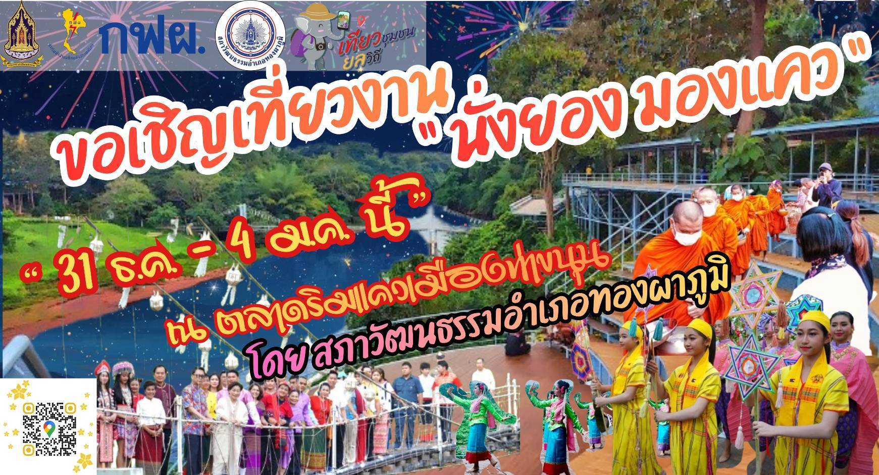 วันที่ 22 ธันวาคม 2568 พระครูวิลาศกาญจนธรรม,ดร. เจ้าอาวาสวัดท่าขนุน ประธานสภาวัฒนธรรม อำเภอทองผาภูมิ ขอเชิญเชิญเที่ยวงาน “นั่งยองมองแคว” ครั้งที่ 1 ระหว่างวันที่ 31 ธันวาคม 2568 ถึงวันที่ 4 มกราคม 2569 ณ ตลาดริมแควเมืองท่าขนุน หมู่1 ตำบท่าขนุน อำเภอทองผาภูมิ ตรงข้ามหน้า (สภ.ทองผาภูมิ)
