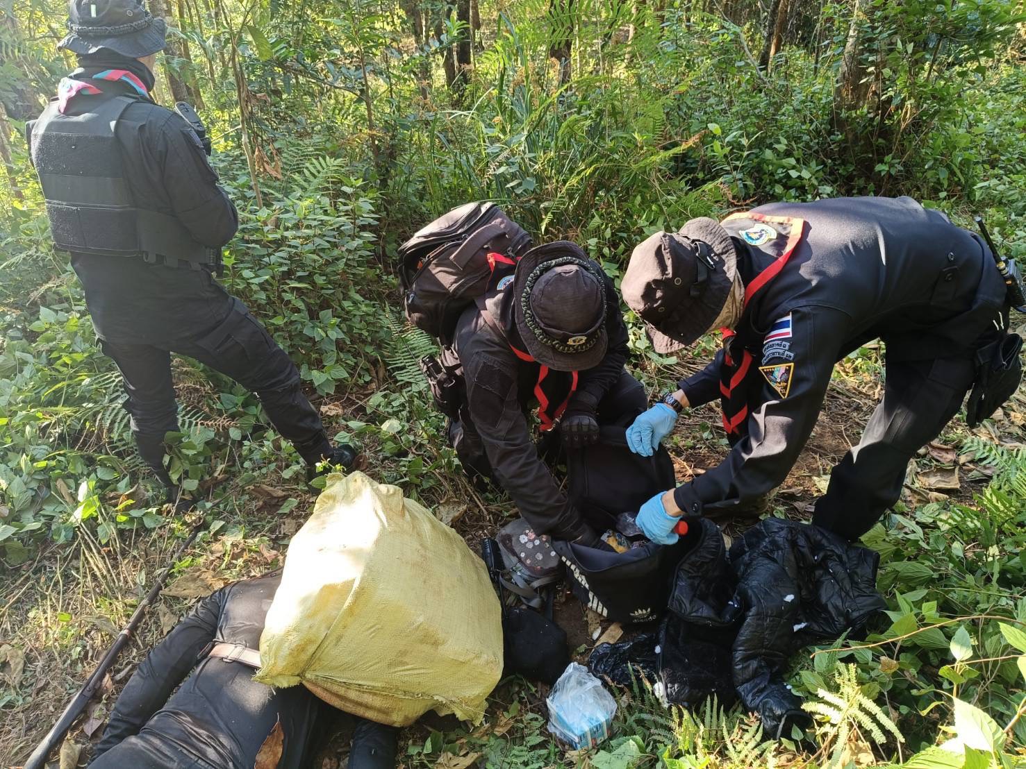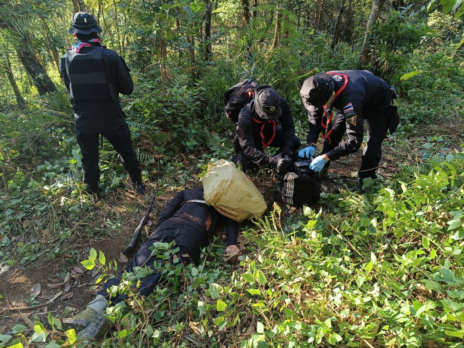 ส่วนกลุ่มบุคคลต้องสงสัยคาดว่าล่าถอยกลับเข้าไปในเขตประเทศเพื่อนบ้าน เนื่องจากเวลาเกิดเหตุเป็นยามวิกาล เจ้าหน้าที่จึงเรียกกำลังเสริมมาควบคุมพื้นที่โดยรอบจุดปะทะเอาไว้เพื่อรอการตรวจพิสูจน์ วันนี้(22ธค68) เวลาประมาณ 07.30 น. เจ้าหน้าที่ กองบังคับการควบคุมทหารพราน ศูนย์ปฏิบัติการกองทัพภาคที่ 3 ร่วมกับ กองร้อยเคลื่อนที่เร็ว กองกำลังผาเมือง เข้าตรวจสอบพื้นที่โดยรอบจุดเกิดเหตุพบกลุ่มศพบุคคลต้องสงสัยนอนเสียชีวิตอยู่ในที่เกิดเหตุ 3 ราย พบกระสอบดัดแปลงเป็นเป้สะพายหลังตกอยู่ 3 เป้ ข้างในเป็นยาเสพติดให้โทศประเภทยาบ้านับได้รวม 500,000 เม็ด ปืนแก๊ปยาวพร้อมเครื่องกระสุน 1 กระบอก ปลอกกระสุนปืนขนาด 7.62 มิลลิเมตร จำนวน 6 ปลอก เป็นต้น