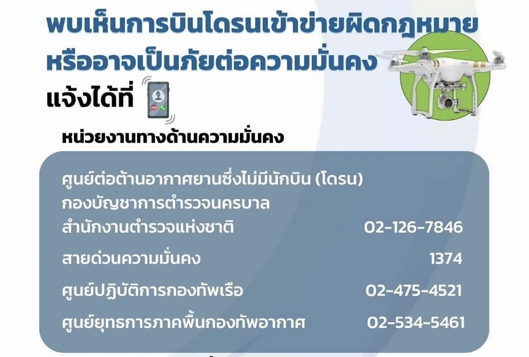 *****พบเห็นการบินโดรนเข้าข่ายผิดกฎหมาย หรืออาจเป็นภัยต่อความมั่นคง แจ้งได้ที่ หน่วยงานทางด้านความมั่นคง ศูนย์ต่อต้านอากาศยานซึ่งไม่มีนักบิน (โดรน) กองบัญชาการตำรวจนครบาล สำนักงานตำรวจแห่งชาติ 02-126-7846 สายด่วนความมั่นคง 1374 ศูนย์ปฏิบัติการกองทัพเรือ 02-475-4521 ศูนย์ยุทธการภาคพื้นกองทัพอากาศ 02-534-5461