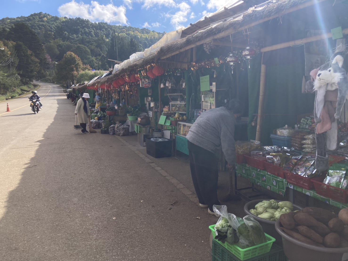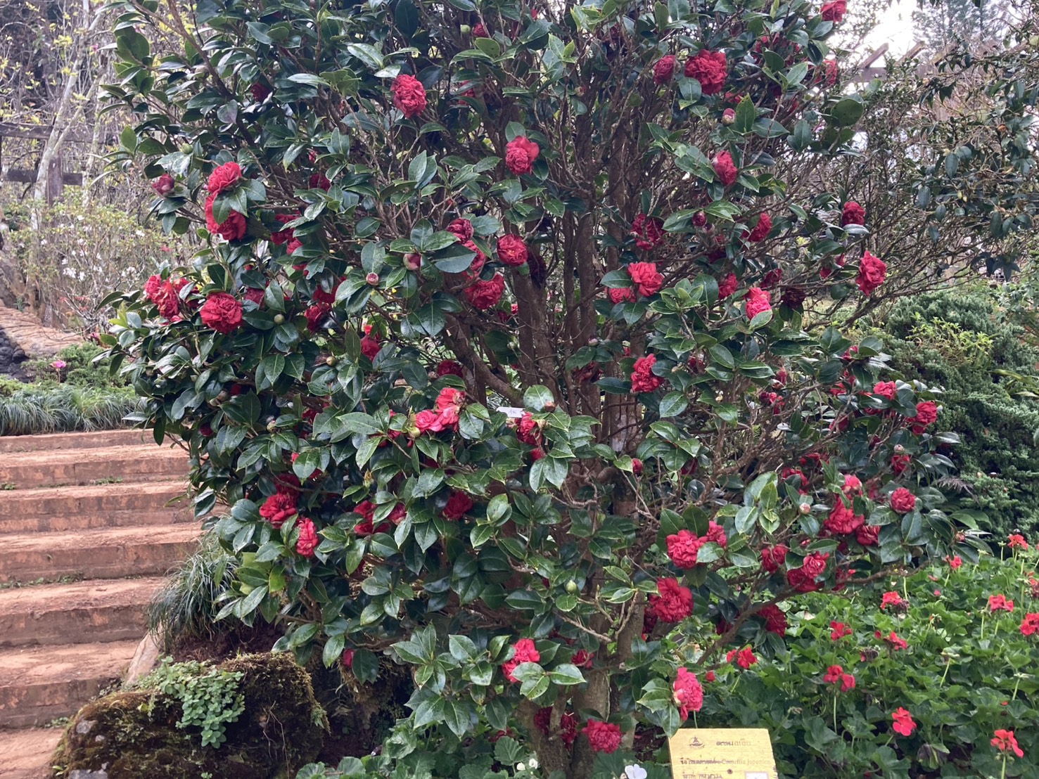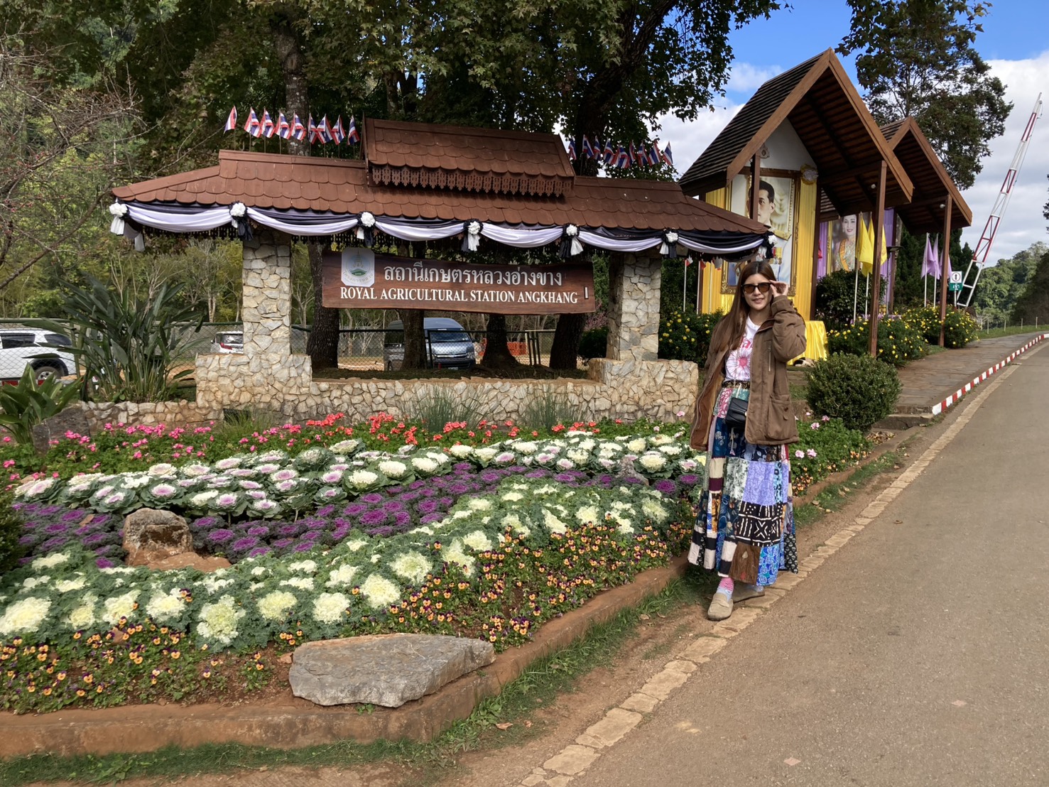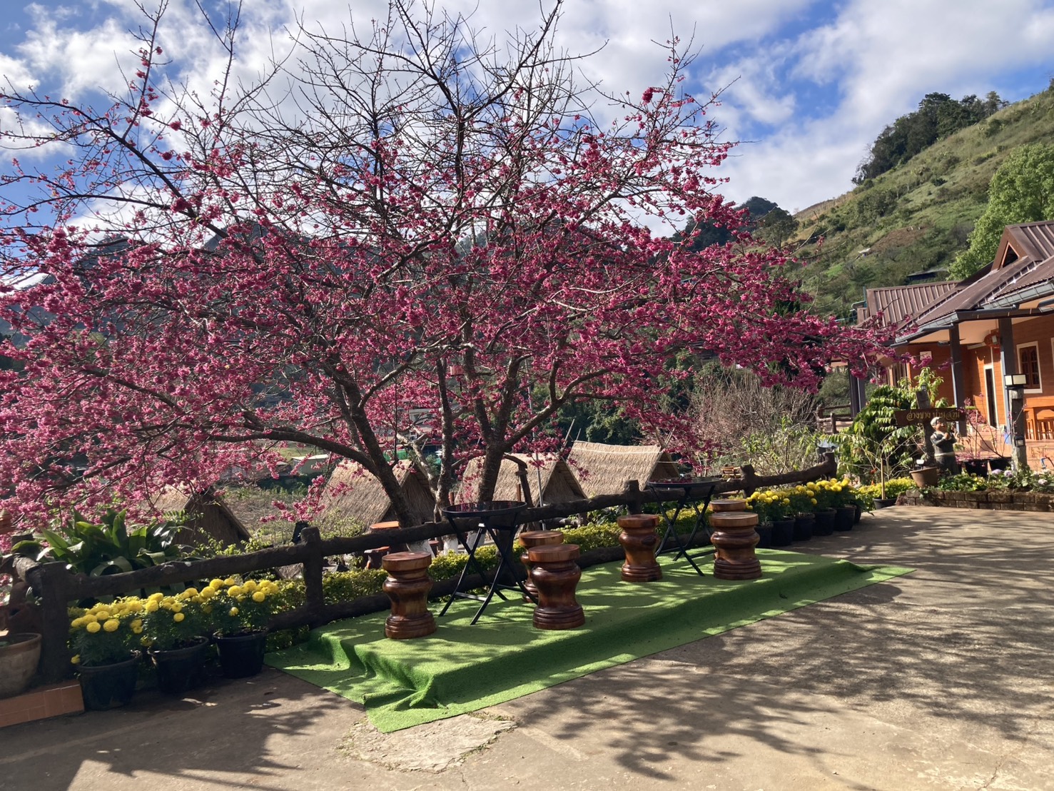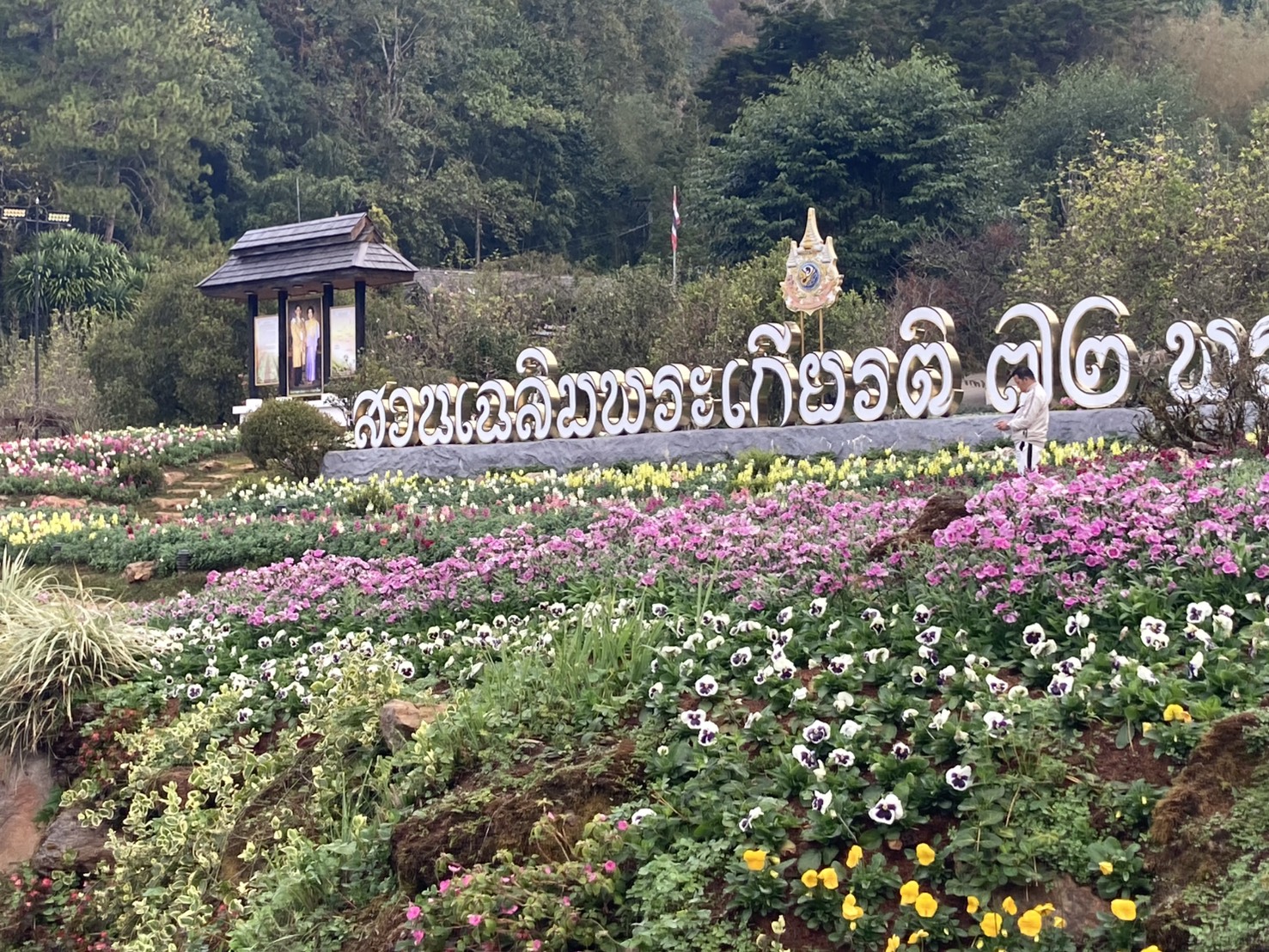 ทางขวาป้ายออกดอกเต็มต้นดอกใหญ่นักท่องเที่ยวสามารถเข้าไปถ่ายรูปได้ และในสวนมีดอกไม้เมืองหนาวออกดอกเต็มสวนสวยงามมากมีดอกไม่เมืองหนาวหลายชนิดที่ปลูกเพื่อให้นักท่องเที่ยวมาสัมผัสความสวยงามพร้ออากาศที่หนาวเย็นจับใจ ยังมีต้นดอกกุหลาบพันปี อีกหลายต้นที่เจ้าหน้าที่นำมาปลูกในสวนทั้งสีแดง สีชมภู กำลังออกดอกบานเต็มต้นดอกใหญ่สวยงามมาก ถ้าเข้าชมช่วงเช้าจะได้เห็นน้ำค้างจับต้นใบและดอกสวยงามถ่ายรูปแบบมีชิวิตชีวา ในแปลงต้นบ๋วยพันปีกำลังออกดอกแข่งกับต้นดอกซากุระมีนักท่องเที่ยวมาถ่ายรูปกันจำนวนมากมีที่จอดรถ