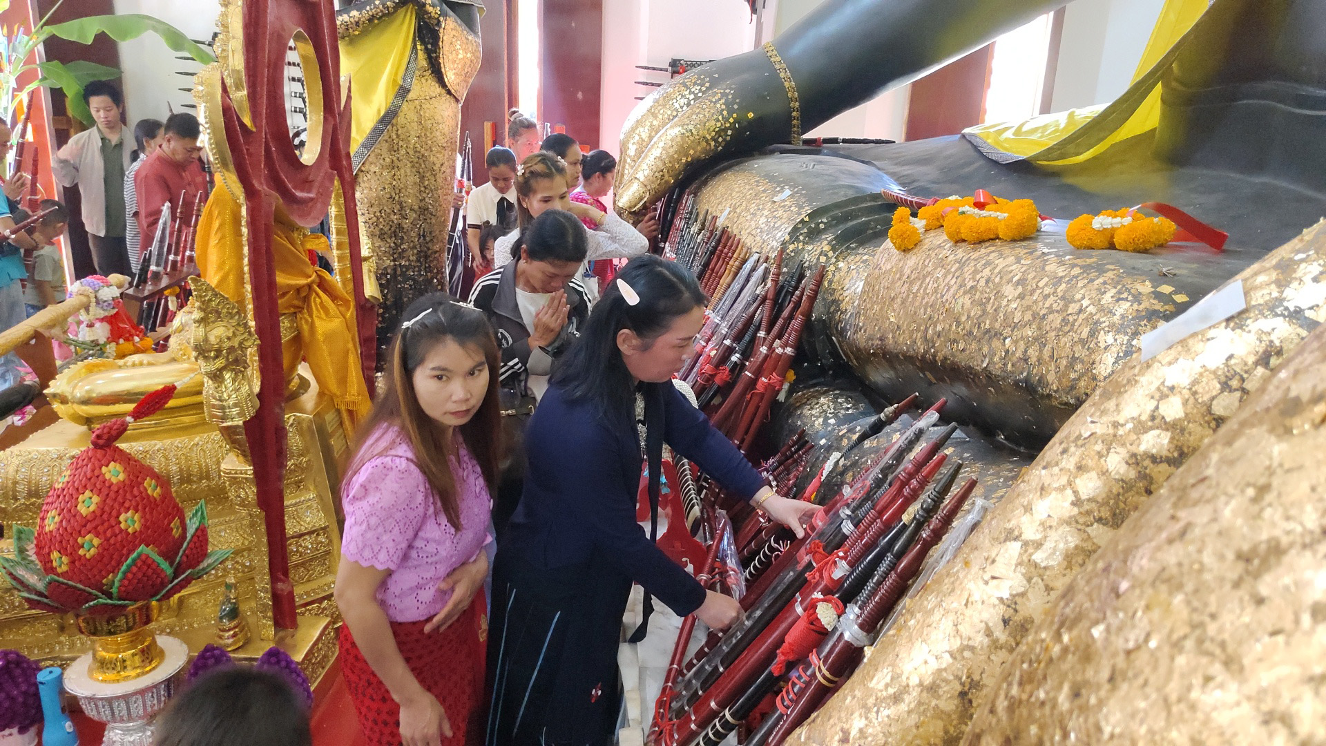 ด้านพระครูโสภิตสุวรรณาภรณ์ เจ้าอาวาสวัดดงเสลา เปิดเผยว่า หลวงพ่อขุดด่าน พระประธานประจำอุโบสถมหาอุตม์ เป็นพระพุทธรูปศักดิ์สิทธิ์ ศิลปะอู่ทองปางพิจารณาชราธรรม หน้าตักกว้าง 16 ศอก สูง 20 ศอก ส่วนประเพณีถวายดาบหลวงพ่อขุนด่าน มีมาตั้งแต่สร้างองค์หลวงพ่อขุนด่าน ซึ่งเป็นปริศนาธรรมสอนให้รู้ว่า เพื่อให้พุทธบริษัททั้งหลาย ตัดซึ่งกิเลส ความโลภ โกรธ หลง ในจิตใจ เป็นการตัดทุกข์ ตัดเคราะห์ ให้เบาบางลง ให้เรื่องร้ายๆ กับกลายเป็นดี ประเพณียกดาบถวายหลวงพ่อขุนด่าน มีหนึ่งเดียวในโลก ชาวบ้านเชื่อว่าได้มาร่วมพิธีแห่ดาบ ยกดาบถวายหลวงพ่อขุนด่าน และได้กราบไหว้ขอพรหลวงพ่อขุนด่าน จะเป็นการตัดกรรม ตัดทุกข์ ตัดโศก ตัดโรค ตัดภัย ตัดสิ่งไม่ดีให้หายออกไปจากชีวิตและครอบครัว และจะมีแต่สิ่งมงคล สิ่งดีๆ เข้ามาในชีวิตและจะทำให้มีโชคมีลาภ