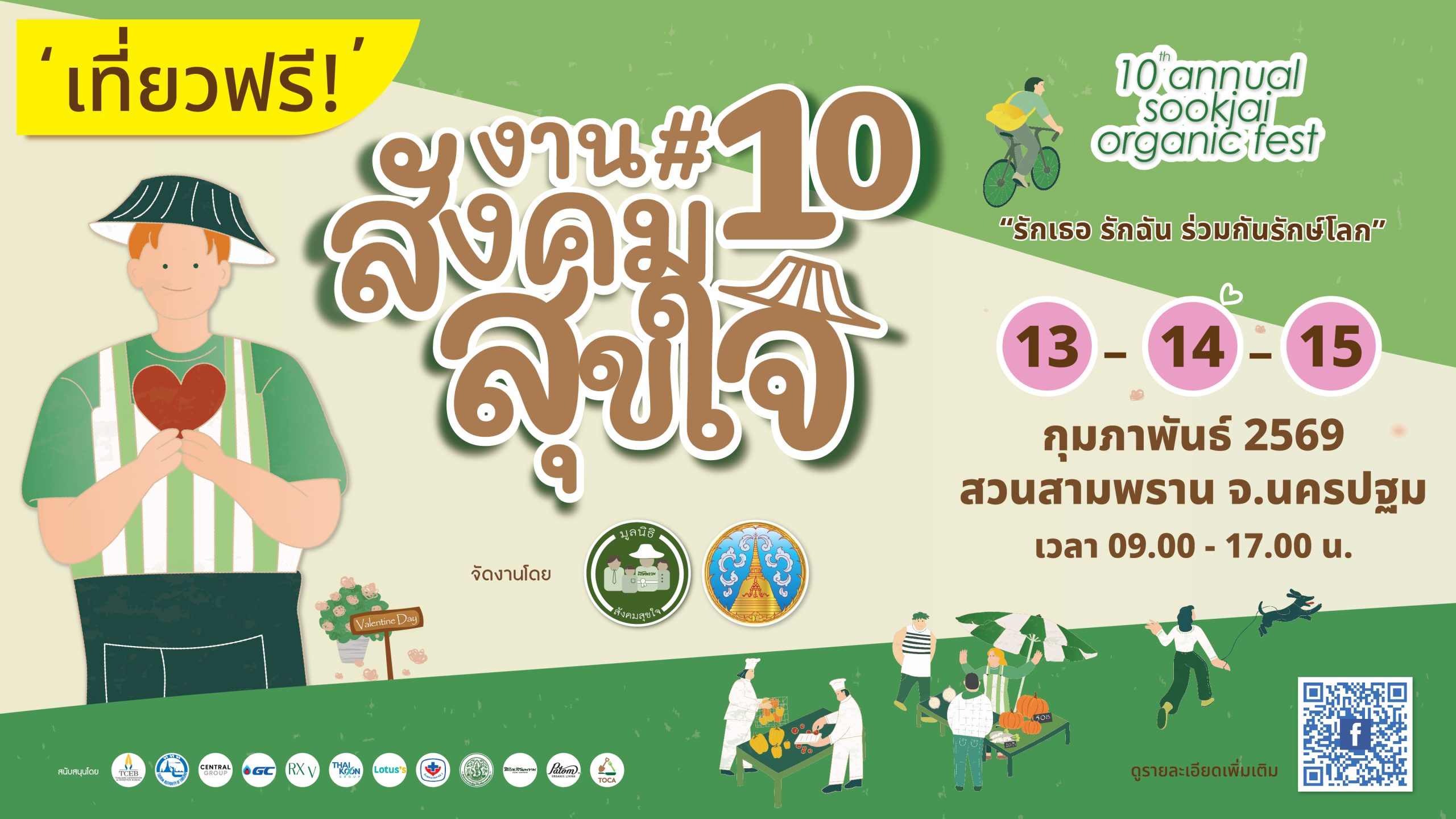 ด้วยคณะกรรมการจัดงานสังคมสุขใจ โดยความร่วมมือของจังหวัดนครปฐม มูลนิธิสังคมสุขใจ หน่วยงราชการ ท้องถิ่น ภาคเอกชน และเครือข่ายเกษตรกรอินทรีย์ทั่วประเทศ กำหนดจัดงาน “สังคมสุขใจ ครั้งที่10 | 10th Annual Sookjai Organic Fest” ระหว่างวันที่13-15 กุมภาพันธ์ 2569 ณ สวนสามพราน อำเภอสามพราน จังหวัดนครปฐม ภายใต้แนวคิด “รักเธอ รักฉัน ร่วมกันรักษ์โลก” การจัดงานมีวัตถุประสงค์เพื่อยกระดับเกษตรกรไทยสู่การเป็นผู้ผลิตเกษตรอินทรีย์ ส่งเสริมการ ดูแลสุขภาพแบบองค์รวม การจัดการสิ่งแวดล้อม และการท่องเที่ยวยั่งยืน ผ่านกระบวนการแลกเปลี่ยนเรียนรู้