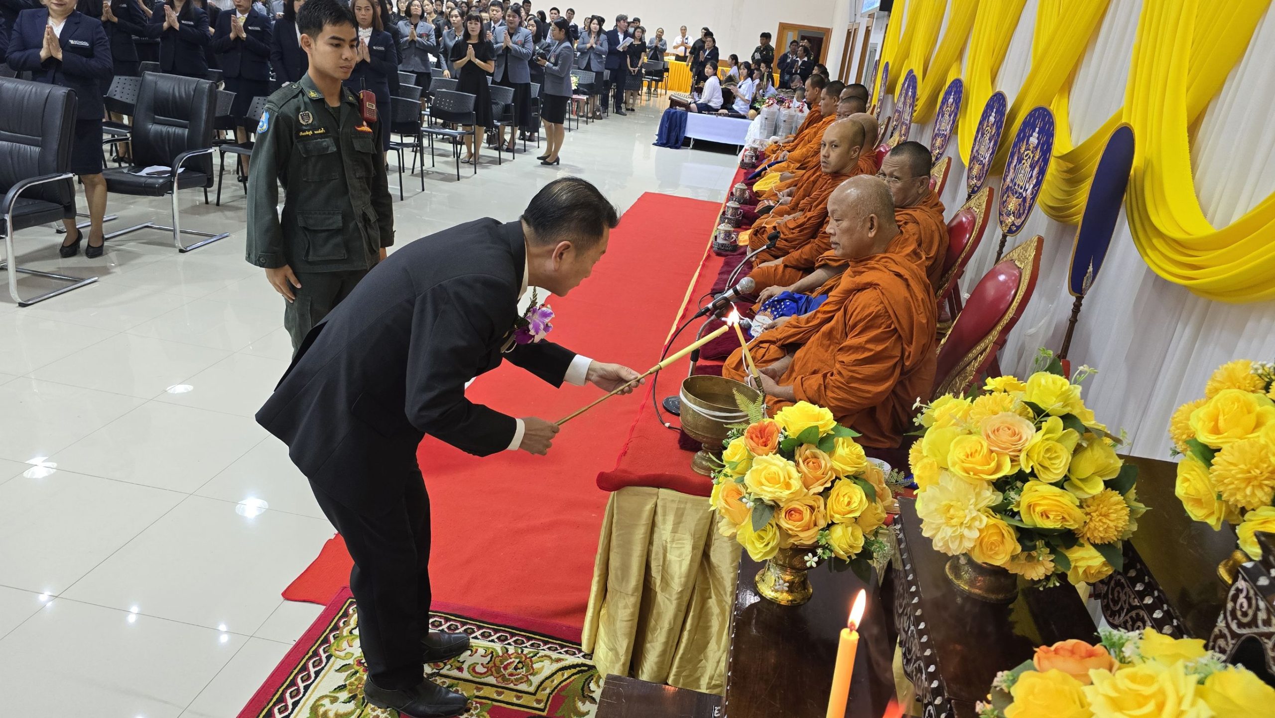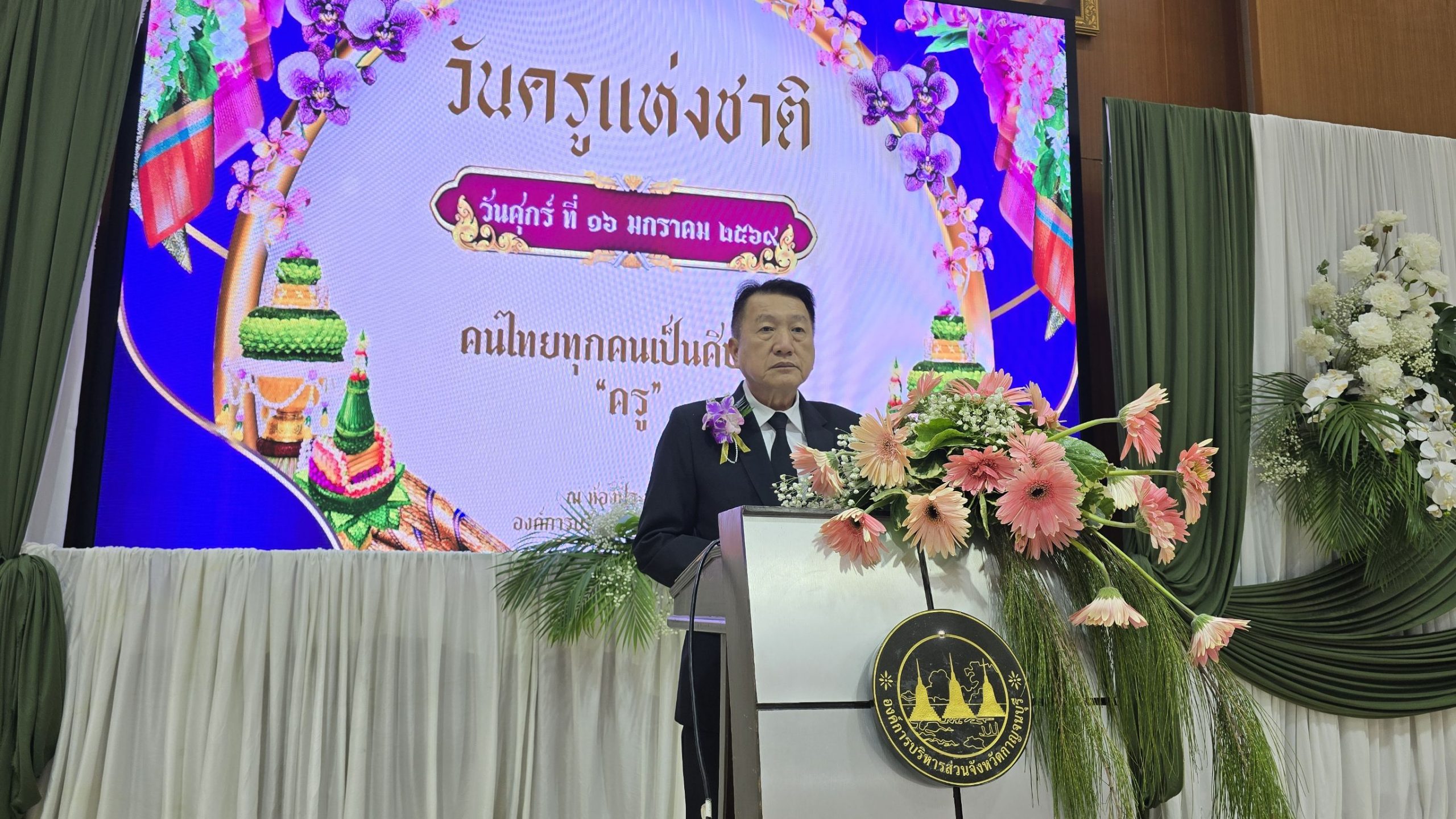 นายวสันต์ (นายกเปี๊ยก) ภูษิตกาญจนา นายกเทศมนตรีเมืองกาญจนบุรี ประธานในพิธีฯ เปิดเผยว่า ผมรู้สึกเป็นเกียรติและยินดีเป็นอย่างยิ่งที่ได้มีโอกาสต้อนรับ “แม่พิมพ์ของชาติ” ผู้ทรงเกียรติทุกท่าน เข้าสู่ โครงการจัดงานวันครู ประจำปี ๒๕๖๙ ห้องบุษราคัมชั้น ๑ ขององค์การบริหารส่วนจังหวัดกาญจนบุรี แห่งนี้ วันครู ๑๖ มกราคม เป็นวันที่มีความหมายลึกซึ้งต่อพวกเราชาวท้องถิ่น เพราะ “ครู อปท.” คือฟันเฟืองสำคัญที่สุดในการขับเคลื่อนยุทธศาสตร์จังหวัดกาญจนบุรี ด้านการพัฒนาคุณภาพชีวิตประชาชนในทุกมิติ และการสืบสานด้านศาสนา ศิลปะ วัฒนธรรมให้ดำรงคงอยู่คู่แผ่นดินไทย การดำเนินงานในวันวันนี้เกิดจากความตั้งใจเชิดซูบทบาทของครู่ ท่ามกลางสังคมเปลี่ยนแปลงไปอย่างรวดเร็ว แม้เทคโนโลยีจะก้าวล้ำเพียงใด แต่ “หัวใจของความเป็นครู” ที่เปี่ยมด้วยความเมตตา ทักษะการอบรมสั่งสอน และการเป็นแบบอย่างที่ดี ตามจรรยาบรรณวิชาชีพ ยังคงเป็นสิ่งสำคัญที่สุดในการหล่อหลอมให้เด็กและเยาวชนเติบโตเป็นพลเมืองที่สมบูรณ์ ในโอกาสอันเป็นมงคลนี้