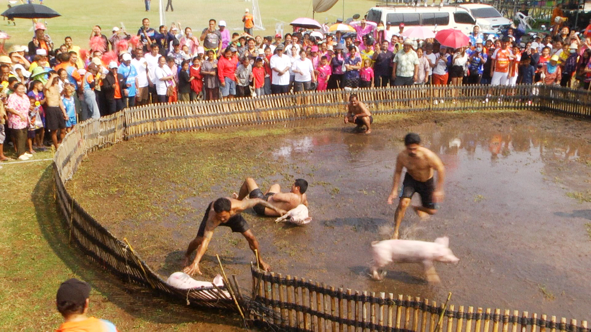 ส่วนไฮไลท์ อยู่ที่การแข่งขันจับหมู โดยให้ทั้ง 10 หมู่บ้าน ส่งตัวแทนมาร่วมแข่งจับหมู ก่อนที่จะปล่อยหมูลงสู่สังเวียน จะให้รถน้ำมาฉีดน้ำใส่พื้นในสังเวียนให้เปียกชุ่มก่อนและเอาน้ำมันพืช ชโลมทาหมูทุกตัวให้ลื่นก่อนปล่อยหมูเข้าสังเวียน แบ่งการแข่งจับหมู 2 รอบ รอบละ 5 คน ส่วนหมูรอบละ 3 ตัวเท่านั้น จะมีผู้ที่จับหมูได้เพียงแค่ 3 คน ส่วนอีก 2 คน กลับบ้านมือเปล่า คนไหนจับหมูได้ จะได้หมูเป็นรางวัลนำกลับบ้านได้เลย