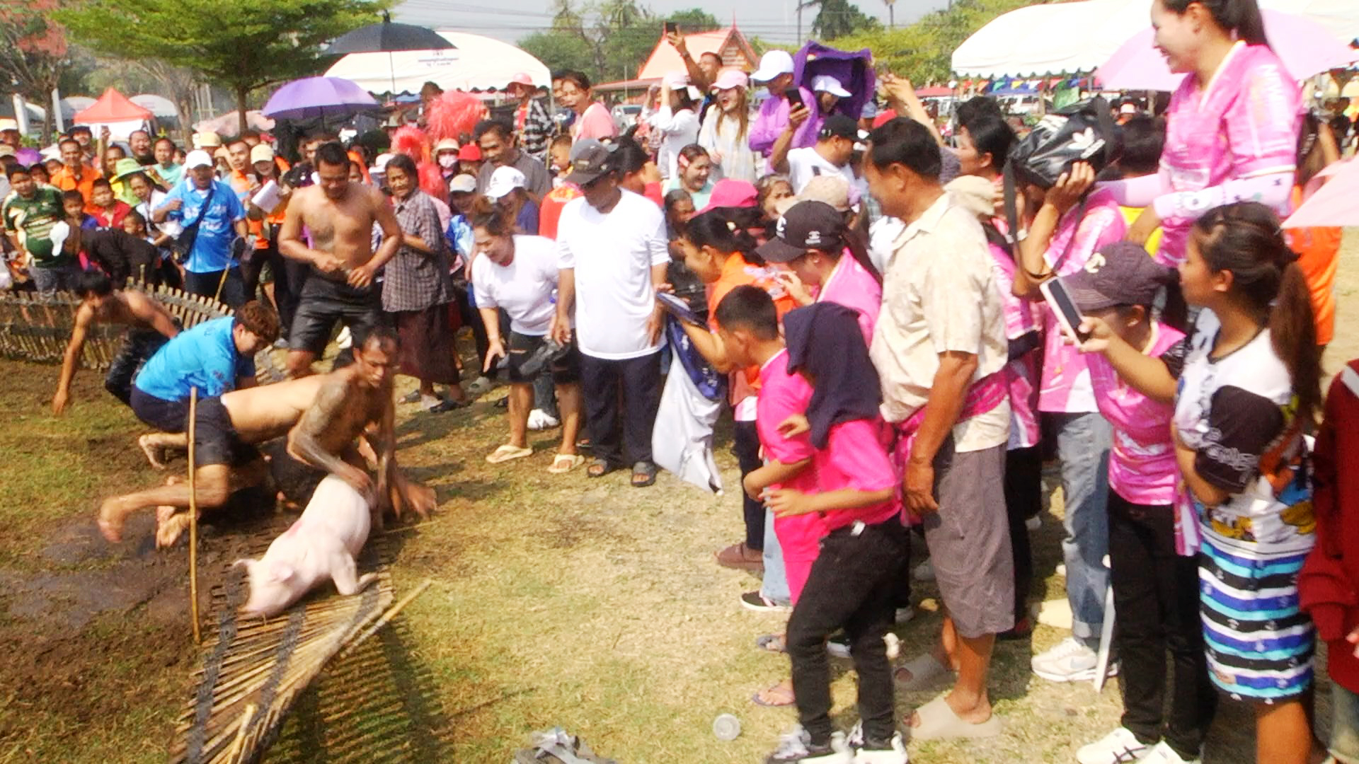 โดยรอบแรกหลังจากปล่อยหมูเข้าสู่สังเวียน นักกีฬาแต่ละคนต่างวิ่งไล่จับหมูที่ทาน้ำมันพืชจนตัวลื่นกันอย่างสนุกสนาน ซึ่งมีกองเชียร์ของที่ละทีมส่งเสียงเชียร์นักกีฬาอยู่ติดขอบสังเวียนกันเสียงดังสนั่น ใช้เวลาเพียงไม่ถึง 5 นาที หมูทั้ง 3 ตัว ถูกจับได้ทั้งหมด ส่วนคนที่จับหมูได้ บอกว่าวิ่งไล่จับหมูมันเหนื่อยแต่ก็สนุก ส่วนหมูที่จับได้จะนำเอาไปเลี้ยงก่อน แต่บางรายบอกว่าอาจจะนำไปทำอาหารเลี้ยงชาวบ้านในชุมชน