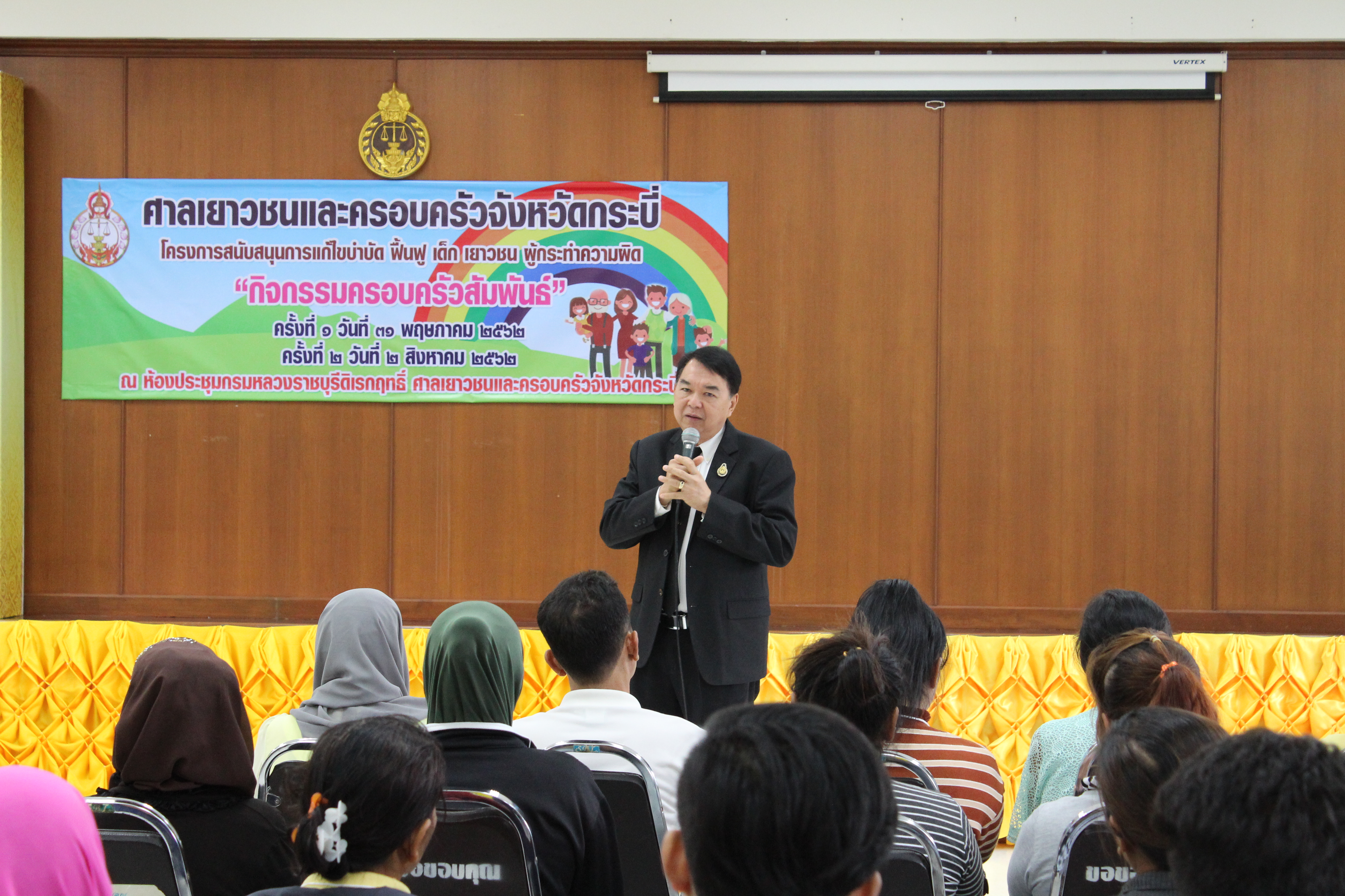 เมื่อวันที่ 31 พฤษภาคม 2562 นายไวกูณฐ์ สว่างสุรีย์ ผู้พิพากษาหัวหน้าศาลเยาวชนและครอบครัวจังหวัดกระบี่ เป็นประธานในพิธีเปิดโครงการสนับสนุนแก้ไข บำบัด ฟื้นฟู เด็ก เยาวชนและครอบครัว กิจกรรมครอบครัวสัมพันธ์ ครั้งที่ 1 ณ ห้องประชุมกรมหลวงราชบุรีดิเรกฤทธิ์ ศาลเยาวชนและครอบครัวจังหวัดกระบี่ โดยกิจกรรมครอบครัวสัมพันธ์ ครั้งที่ 1 นี้ เป็นการจัดอบรมให้แก่บิดา มารดา หรือผู้ปกครองของเด็กและเยาวชนที่อยู่ระหว่างศาลมีคำสั่งให้ใช้มาตรการแก้ไข บำบัด ฟื้นฟู แทนการพิพากษาคดีอาญา ซึ่งมีวัตถุประสงค์เพื่อสร้างความรู้ความเข้าใจและทัศนคติที่ดีแก่บิดา มารดา หรือผู้ปกครองถึงวิธีการเลี้ยงดูบุตรหลานอย่างเหมาะสมตามหลักจิตวิทยาวัยรุ่นให้เกิดความรักความสัมพันธ์ที่ดีในครอบครัว อันจะนำไปสู่การปรับเปลี่ยนพฤติกรรมของเด็กและเยาวชนให้ตระหนักถึงคุณค่าของตนเอง ไม่ให้หวนกลับไปกระทำความผิดซ้ำอีก