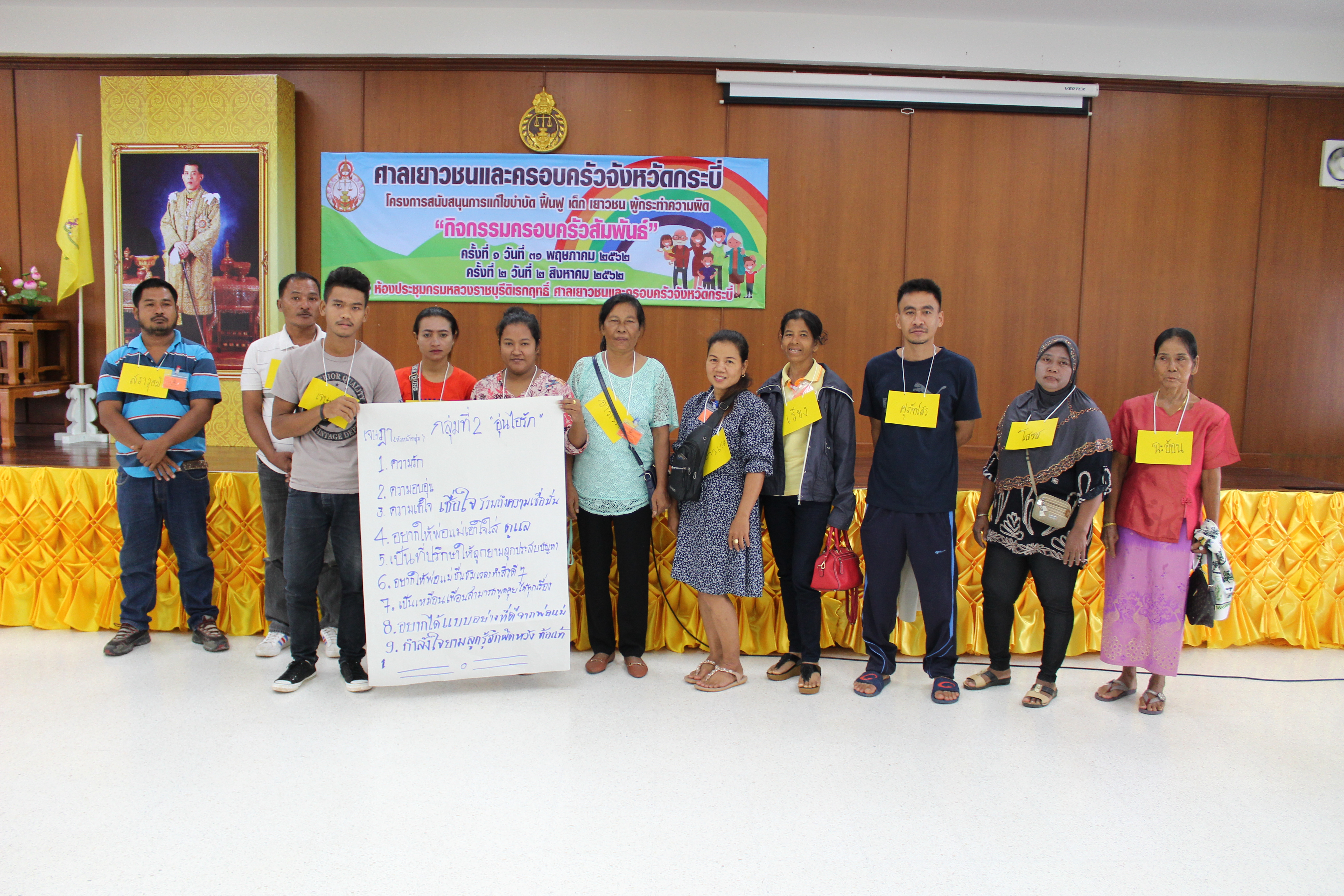ทั้งนี้ ศาลเยาวชนและครอบครัวจังหวัดกระบี่จะดำเนินการจัดกิจกรรมครอบครัวสัมพันธ์ ครั้งที่ ๒ ในวันที่ ๒ สิงหาคม ๒๕๖๒ ซึ่งจะเป็นการจัดอบรมให้แก่บิดา มารดา หรือผู้ปกครอง รวมทั้งเด็กและเยาวชนซึ่งเป็นบุตรหลาน ณ ห้องประชุมกรมหลวงราชบุรีดิเรกฤทธิ์ ศาลเยาวชนและครอบครัวจังหวัดกระบี่