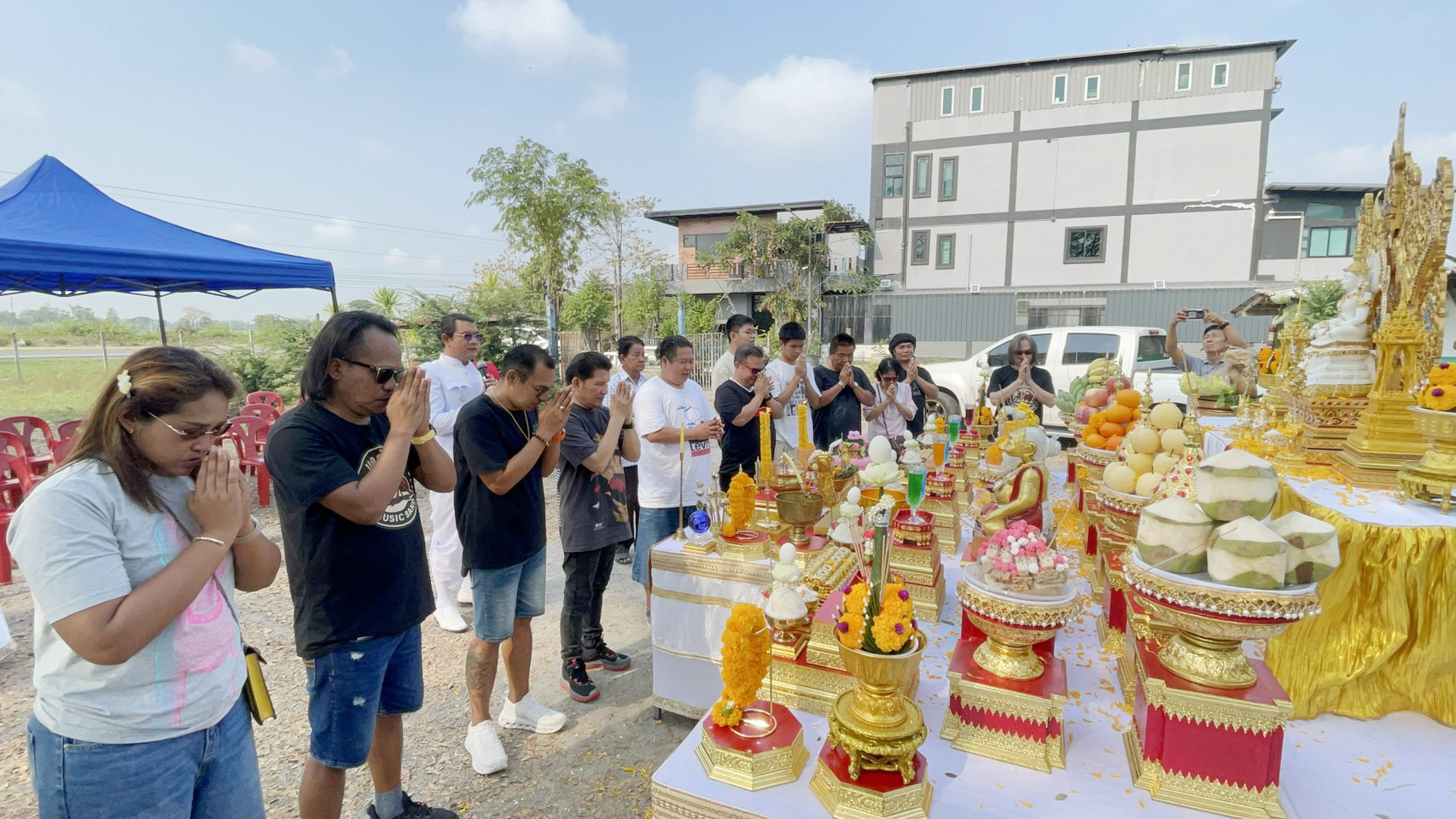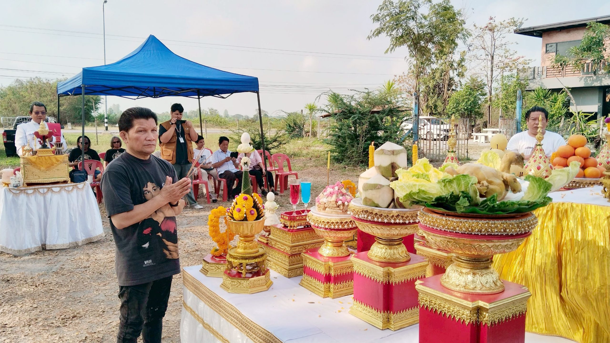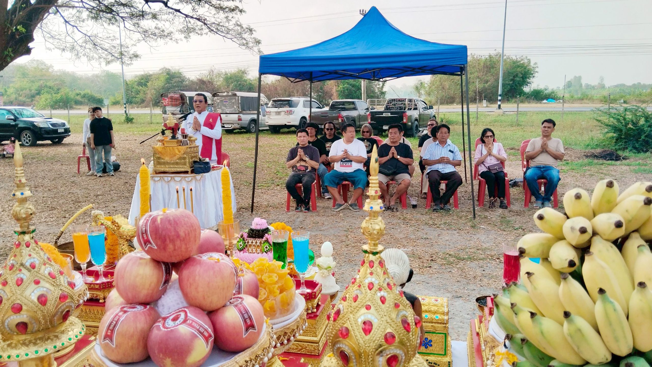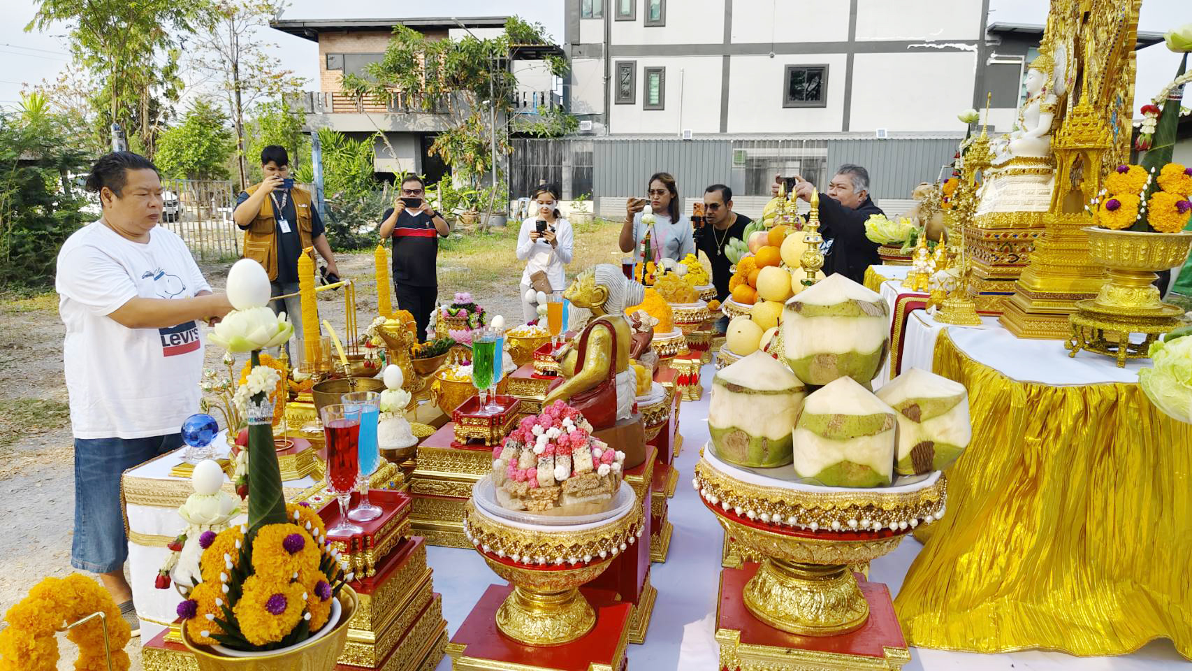 ซึ่งมีประชาชนที่สนใจเข้ามาร่วมพิธีบวงสรวงกันจำนวนมาก โดยมีพราหมณ์ (กอล์ฟ) หรือธรรมบุตร พราหมณ์ชื่อดังอำเภออู่ทอง มาประกอบพิธีบวงสรวง ได้มีการจัดตั้งโต๊ะเครื่องบวงสรวงคาวหวานจำนวนมาก ประกอบด้วย หัวหมู เป็ด ไก่ ขนมมงคล และผลไม้มงคล นา นา ชนิด พร้อมกับได้โปรยข้าวตอกดอกไม้ เพื่อความเป็นสิริมงคล