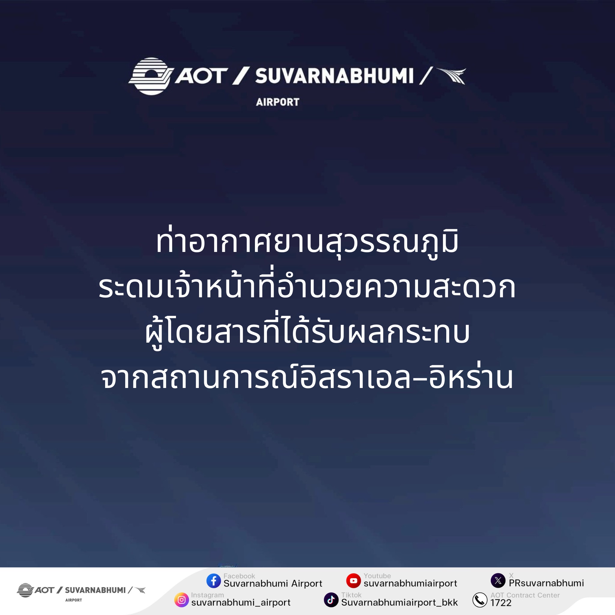 *****เมื่อคืนวันที่ 28 กุมภาพันธ์ 2569 ท่าอากาศยานสุวรรณภูมิ (ทสภ.) ได้ระดมเจ้าหน้าที่ดูแลและอำนวยความสะดวกแก่ผู้โดยสารที่ได้รับผลกระทบจากสถานการณ์ความไม่สงบระหว่างประเทศอิสราเอล – อิหร่าน โดยมีสายการบินที่ได้รับผลกระทบ 8 สายการบิน ได้แก่ EL AL Israel Airlines, Air Arabia, Emirates Qatar Airways, Etihad Airways ,Gulf Air, Arkia Israel Inland Airlines และ Kuwait Airways ยกเลิกเที่ยวบินรวม 16 เที่ยวบิน แบ่งเป็นเที่ยวบินขาออก 14 เที่ยวบิน และเที่ยวบินขาเข้า 2 เที่ยวบิน