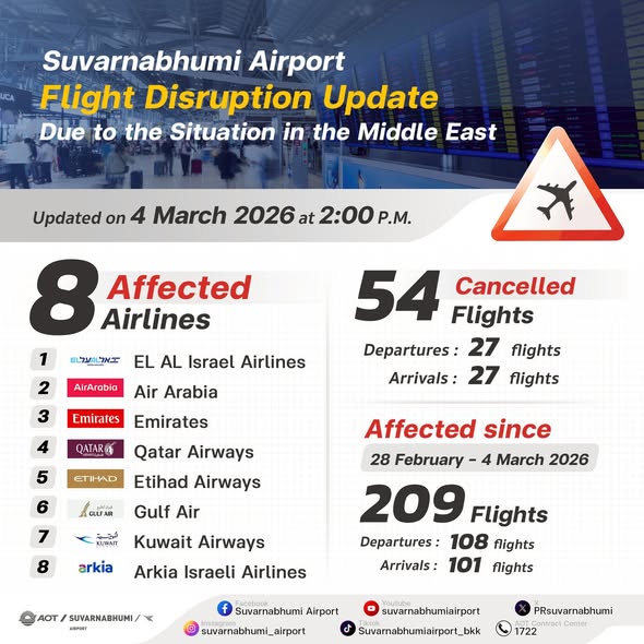 🙏 Suvarnabhumi Airport continues to closely monitor the situation and coordinate with the affected airlines to ensure proper passenger care and assistance.