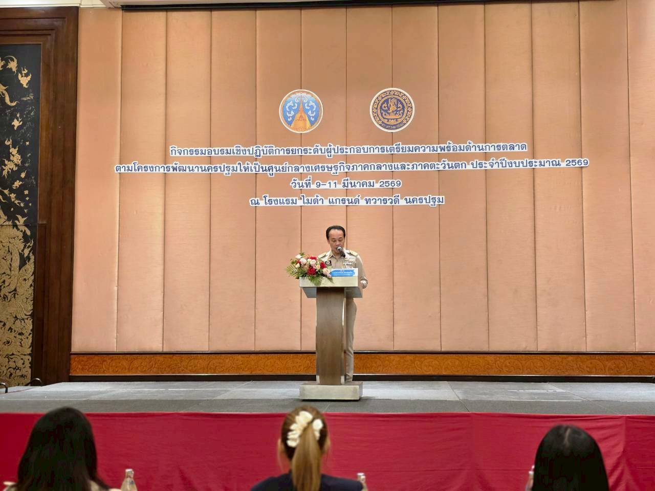 วันที่ 9 มีนาคม พ.ศ. 2569 นายสมาวิษฎ์ สุพรรณไพ รองผู้ว่าราชการจังหวัดนครปฐม เป็นประธานเปิดอบรมเชิงปฏิบัติการยกระดับผู้ประกอบการเตรียมคามพร้อมด้านการตลาด ตามโครงการพัฒนานครปฐมให้เป็นศูนย์กลางเศรษฐกิจภาคกลางและภาคตะวันตก ที่ห้องทวารวดี 2 โรงแรมไมด้า แกรนด์ ทวารวดีนครปฐม โดยมีหัวหน้าส่วนราชการ วิทยากรผู้ทรงคุณวุฒิ และผู้ประกอบการด้านอาหารของจังหวัดนครปฐม เข้าร่วมอบรมในครั้งนี้