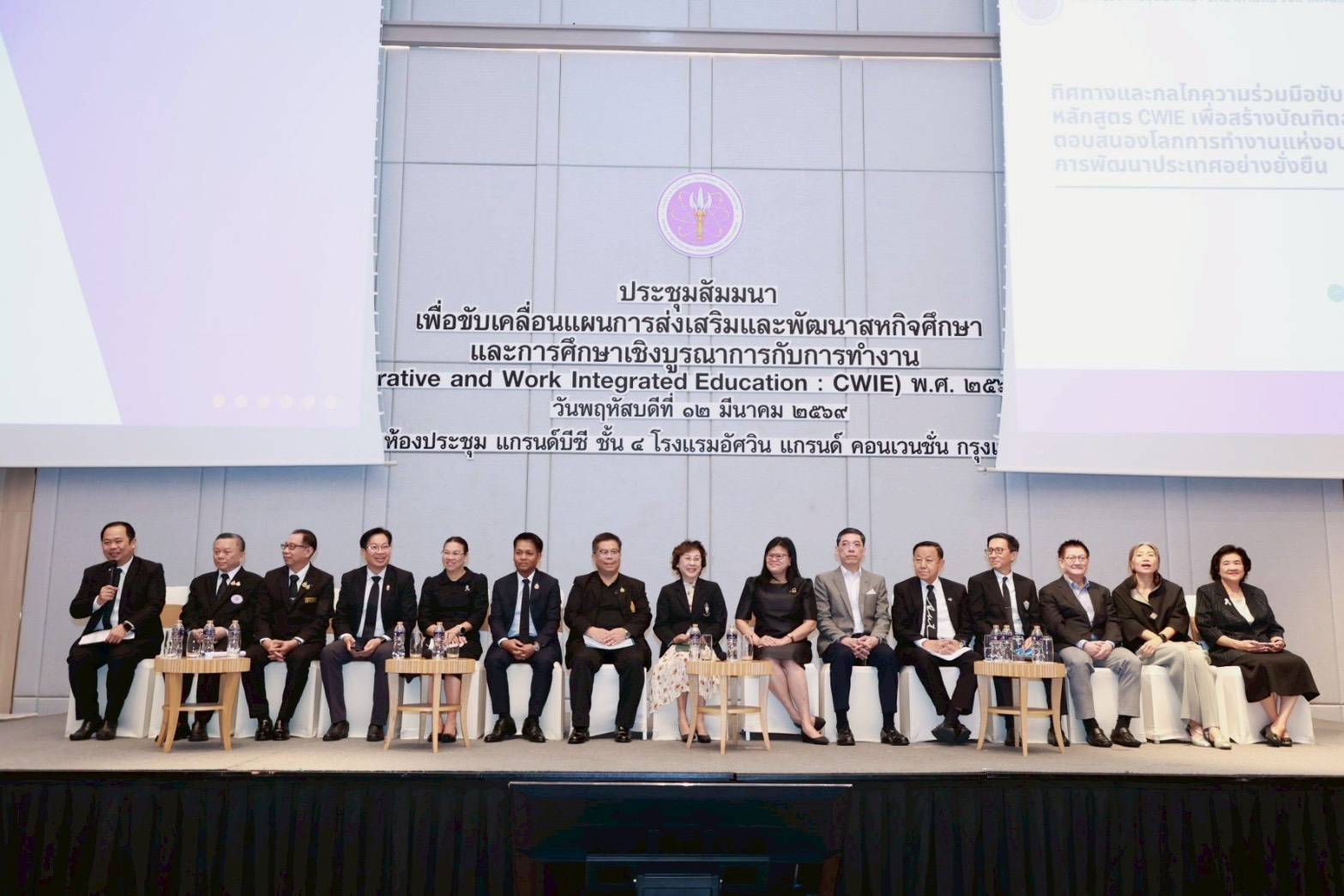 นอกจากนี้ ภายในงานยังมีการเสวนาในหัวข้อ “ทิศทางและกลไกความร่วมมือขับเคลื่อนหลักสูตร CWIE เพื่อสร้างบัณฑิตสมรรถนะสูงตอบสนองโลกการทำงานแห่งอนาคตและการพัฒนาประเทศอย่างยั่งยืน” โดย รศ.ดร.อุดมวิทย์ ไชยสกุลเกียรติ ได้ร่วมขึ้นเวทีเสวนากับผู้บริหารจากสถาบันอุดมศึกษาและหน่วยงานที่เกี่ยวข้อง เพื่อแลกเปลี่ยนความคิดเห็น แนวทางการพัฒนาหลักสูตร และกลไกความร่วมมือในการขับเคลื่อนการศึกษาเชิงบูรณาการกับการทำงานให้มีประสิทธิภาพมากยิ่งขึ้น อันจะนำไปสู่การผลิตบัณฑิตที่มีสมรรถนะตรงกับความต้องการของภาคอุตสาหกรรมและตลาดแรงงานในอนาคตอย่างยั่งยืน