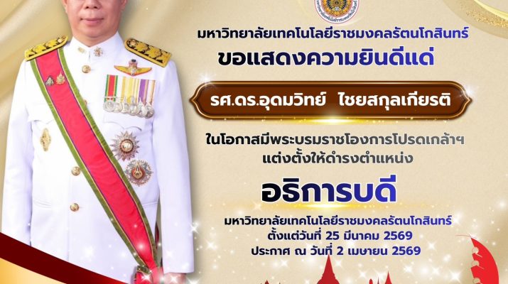 มหาวิทยาลัยเทคโนโลยีราชมงคลรัตนโกสินทร์ ขอแสดงความยินดีแด่ รศ.ดร.อุดมวิทย์ ไชยสกุลเกียรติ ในโอกาสมีพระบรมราชโองการโปรดเกล้าโปรดกระหม่อมแต่งตั้ง ดำรงตำแหน่ง อธิการบดีมหาวิทยาลัยเทคโนโลยีราชมงคลรัตนโกสินทร์ ตั้งแต่วันที่ 25 มีนาคม 2569