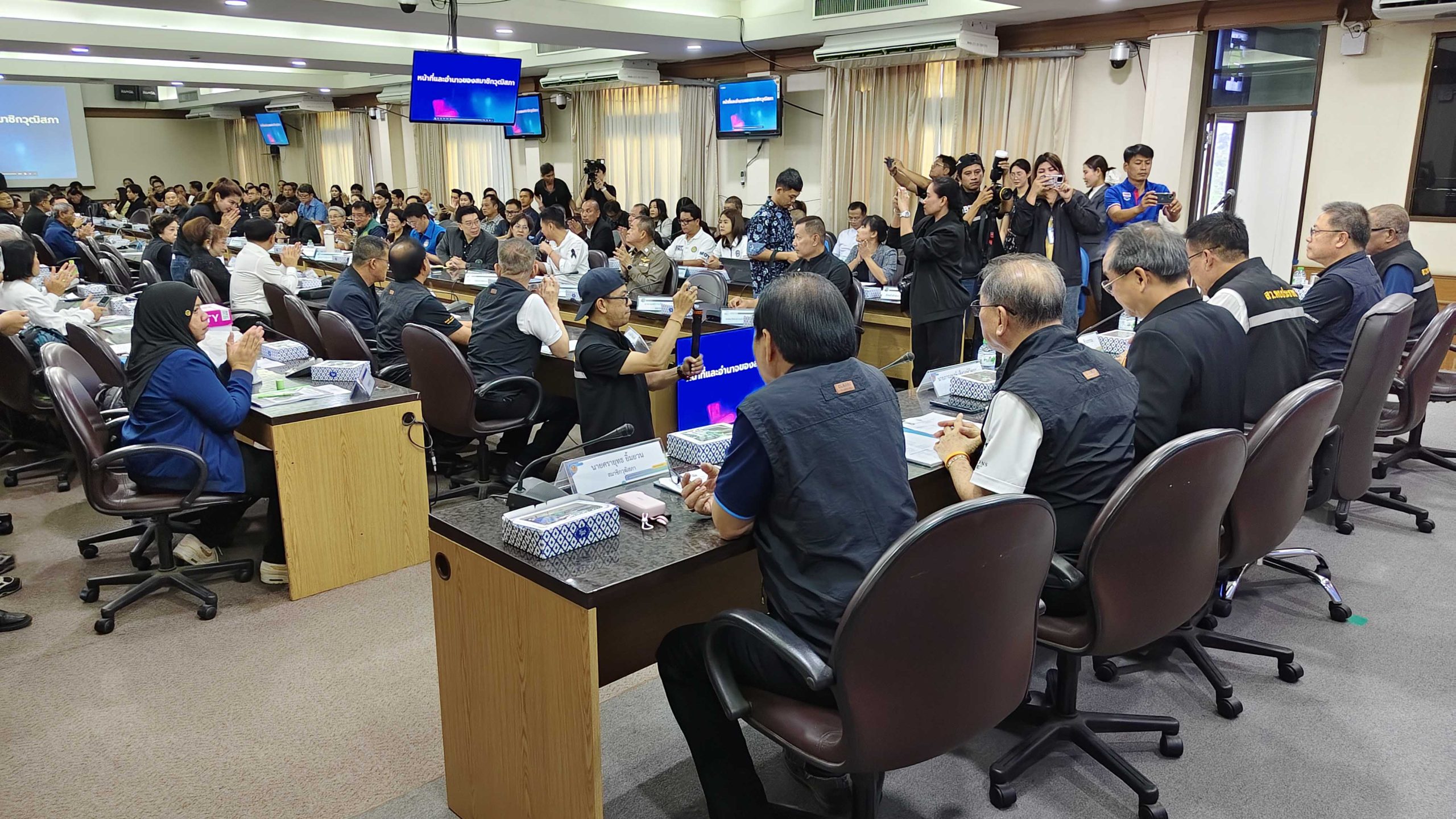 จากนั้นคณะ เข้าร่วมประชุม ณ ศาลากลางจังหวัดสุพรรณบุรี ร่วมกับนายกลวัชร ทรัพย์ส่งสุข รองผู้วาราชการจังหวัดสุพรรณบุรี นายสิทธิพร คงหอม นายอำเภอเมืองสุพรรณบุรี นายธรรศ ศรีดุษฎี ผู้ช่วยป้องกันจังหวัดสุพรรณบุรี หัวหน้าส่วนราชการที่เกี่ยวข้อง ผู้นำองค์กรปกครองส่วนท้องถิ่น ผู้นำชุมชน และประชาชน จำนวน 100 คน เข้าร่วมประชุมและให้ข้อมูลแก่คณะของสมาชิกวุฒิสภา