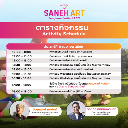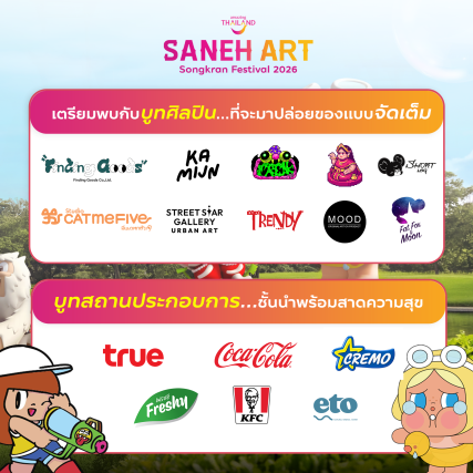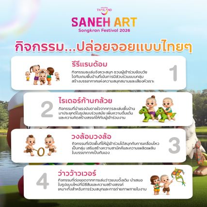 การท่องเที่ยวแห่งประเทศไทย (ททท.) จัดงาน “Saneh Art by Songkran Festival 2026” ระหว่างวันที่ 11–30 เมษายน 69 เพื่อส่งเสริมภาพลักษณ์การท่องเที่ยวไทยผ่านมิติของศิลปะร่วมสมัย (Contemporary Art) ผสานอัตลักษณ์วัฒนธรรมประเพณีสงกรานต์ อันเป็นเอกลักษณ์ของประเทศไทย โดยมีวัตถุประสงค์เพื่อยกระดับประสบการณ์การท่องเที่ยว สร้างความหลากหลายของสินค้าและบริการทางการท่องเที่ยว ตลอดจนกระตุ้นการเดินทางและการใช้จ่ายของนักท่องเที่ยวทั้งชาวไทยและชาวต่างประเทศในช่วงเทศกาลสำคัญ