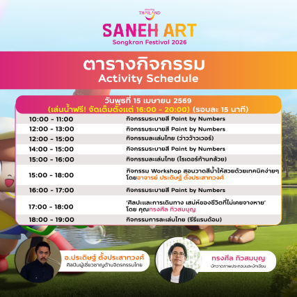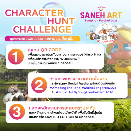 พร้อมติดแฮชแท็ก#AmazingThailand#MahaSongkran2026 และ #SanehArtBySongkranFestival2026 แสดงหลักฐานการเข้าร่วมกิจกรรม การสะสมตราประทับ และการเผยแพร่ผ่านสื่อสังคมออนไลน์ ต่อเจ้าหน้าที่ภายในพื้นที่จัดงานเพื่อตรวจสอบ ผู้ที่ปฏิบัติตามเงื่อนไขครบถ้วน จะได้รับสิทธิ์ร่วมลุ้นของรางวัล Limited Edition ที่ศิลปินออกแบบมีเฉพาะภายในพื้นที่จัดงาน