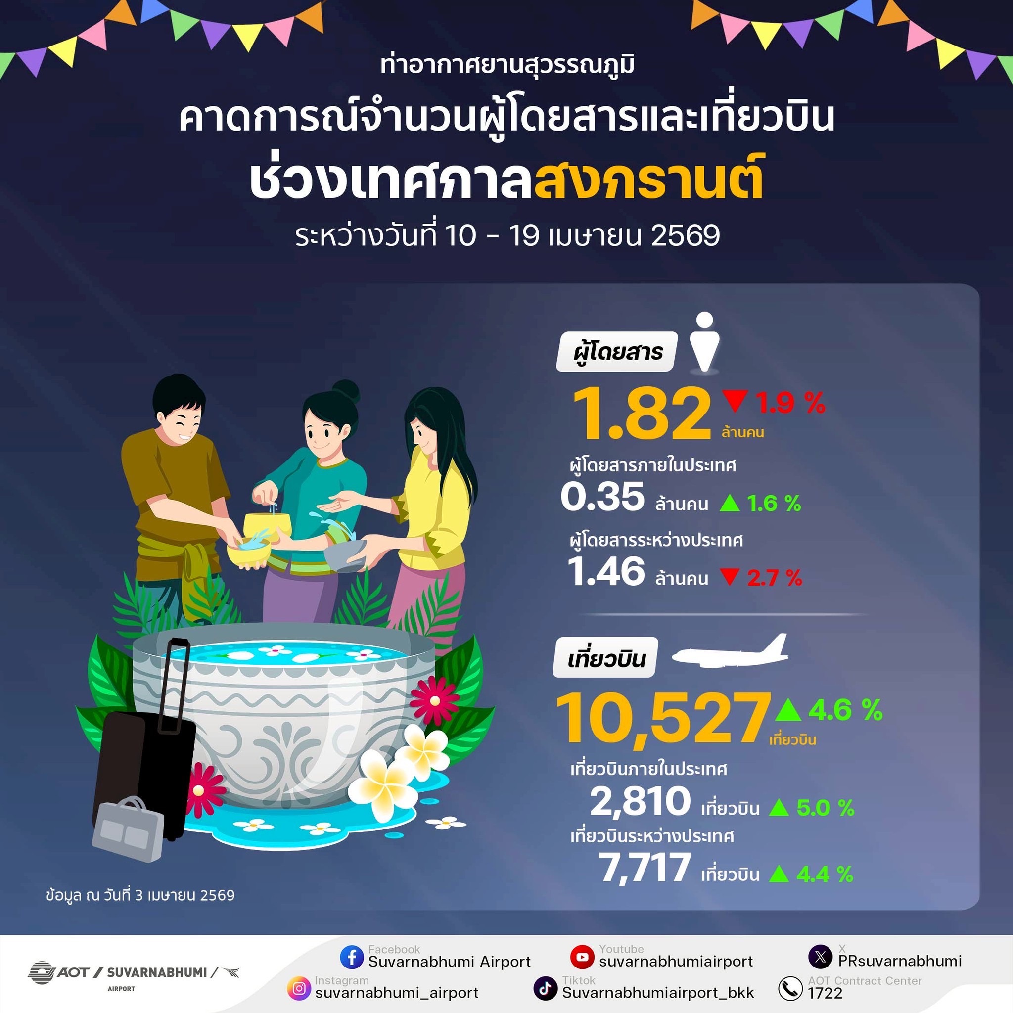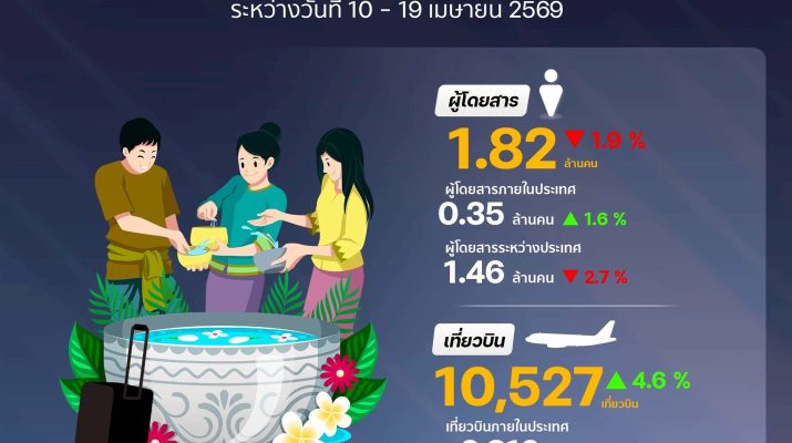 *****เมื่อวันที่ 8 เมษายน 2569นายกิตติพงศ์ กิตติขจร ผู้อำนวยการท่าอากาศยานสุวรรณภูมิ บริษัท ท่าอากาศยานไทย จำกัด (มหาชน) เปิดเผยว่า ในช่วงเทศกาลสงกรานต์ประจำปี 2569 นี้ ทสภ. คาดการณ์จำนวนผู้โดยสารในภาพรวมที่เดินทางผ่าน ทสภ. ระหว่างวันที่ 10 – 19 เมษายน 2569 (รวม 10 วัน) ประมาณ 1,820,000 คน หรือเฉลี่ยวันละประมาณ 182,000 คน ลดลงจากปีที่ผ่านมาในช่วงเวลาเดียวกันร้อยละ 1.9 สำหรับประมาณการเที่ยวบินในช่วงดังกล่าวคาดว่าจะมีเที่ยวบินประมาณ 11,000 เที่ยวบิน เฉลี่ยวันละ 1,100 เที่ยวบิน เพิ่มขึ้นจากปีที่ผ่านมาในช่วงเวลาเดียวกันร้อยละ 4.6โดยมีสายการบินขอเพิ่มเที่ยวบินพิเศษและเช่าเหมาลำ (Extra & Charter Flight) จำนวน 9 สายการบิน รวมทั้งสิ้น130 เที่ยวบิน ซึ่งสายการบินที่ขอเพิ่มเที่ยวบินพิเศษมากที่สุด 3 อันดับแรก คือ สายการบิน AIR MACAU สายการบินบางกอกแอร์เวย์ส และสายการบินไทยเวียตเจ็ทแอร์