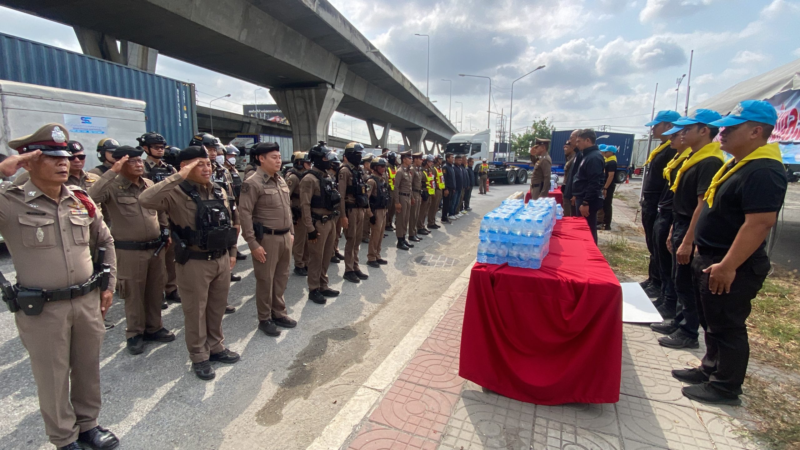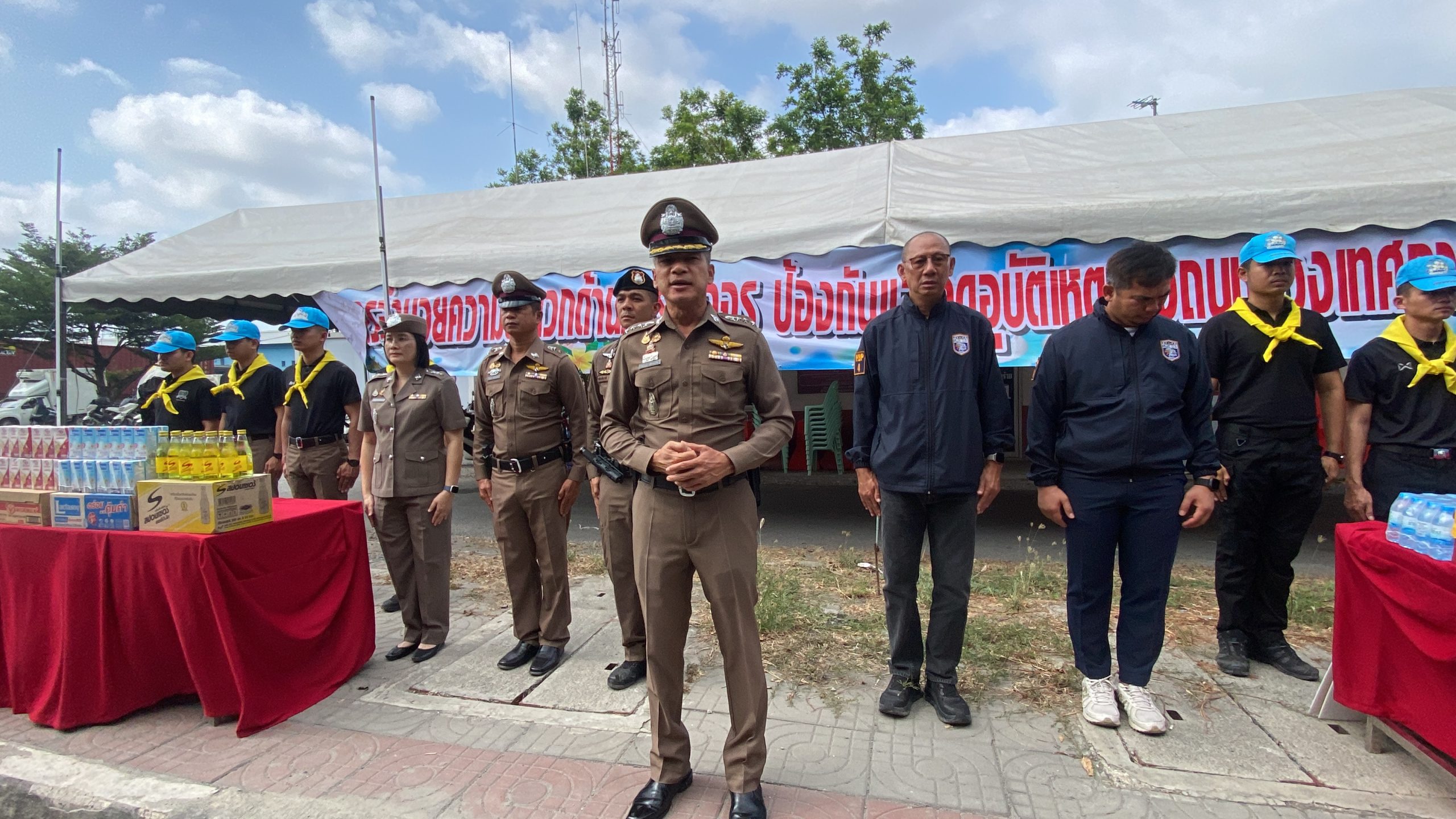 พ.ต.อ.ไพโรจน์ เพ็ชรพลอย ผกก.สภ.บางพลี พ.ต.ท.เถลิงเกียรติ มณีอินทร รอง ผกก.ป.สภ.บางพลี พ.ต.ท.ภาวัต รัตนาภรณ์ รอง ผกก.สส.สภ.บางพลี พ.ต.ท.ยุทธชัย สุดเสน่ห์ สว.จร.สภ.บางพลีพ.ต.ท.หญิงณัฐธยาน์ พัชระบุญเรือง สว.อก.สภ.บางพลี พ.ต.ท.ศรีพงษ์ น้อยสุวรรณ์ สวป.สภ.บางพลี พ.ต.ต.สันติราษฏร์ เงินมั่น สว.สส.สภ.บางพลี พร้อมข้าราชการตำรวจ สภ.บางพลี ข้าราชการตำรวจจิตอาสา สภ.บางพลี ร่วมปล่อยแถวการ อำนวยความสะดวกด้านการจราจรป้องกันและลดอุบัติเหตุทางถนนช่วงเทศกาลสงกรานต์ ประจำปี 2569 และแจกหมวกกันน็อก น้ำดื่ม เครื่องชูกำลัง ณ จุดสกัดคลองส่งน้ำ สภ.บางพลี ต.บางโฉลง อ.บางพลี จ.สมุทรปราการ