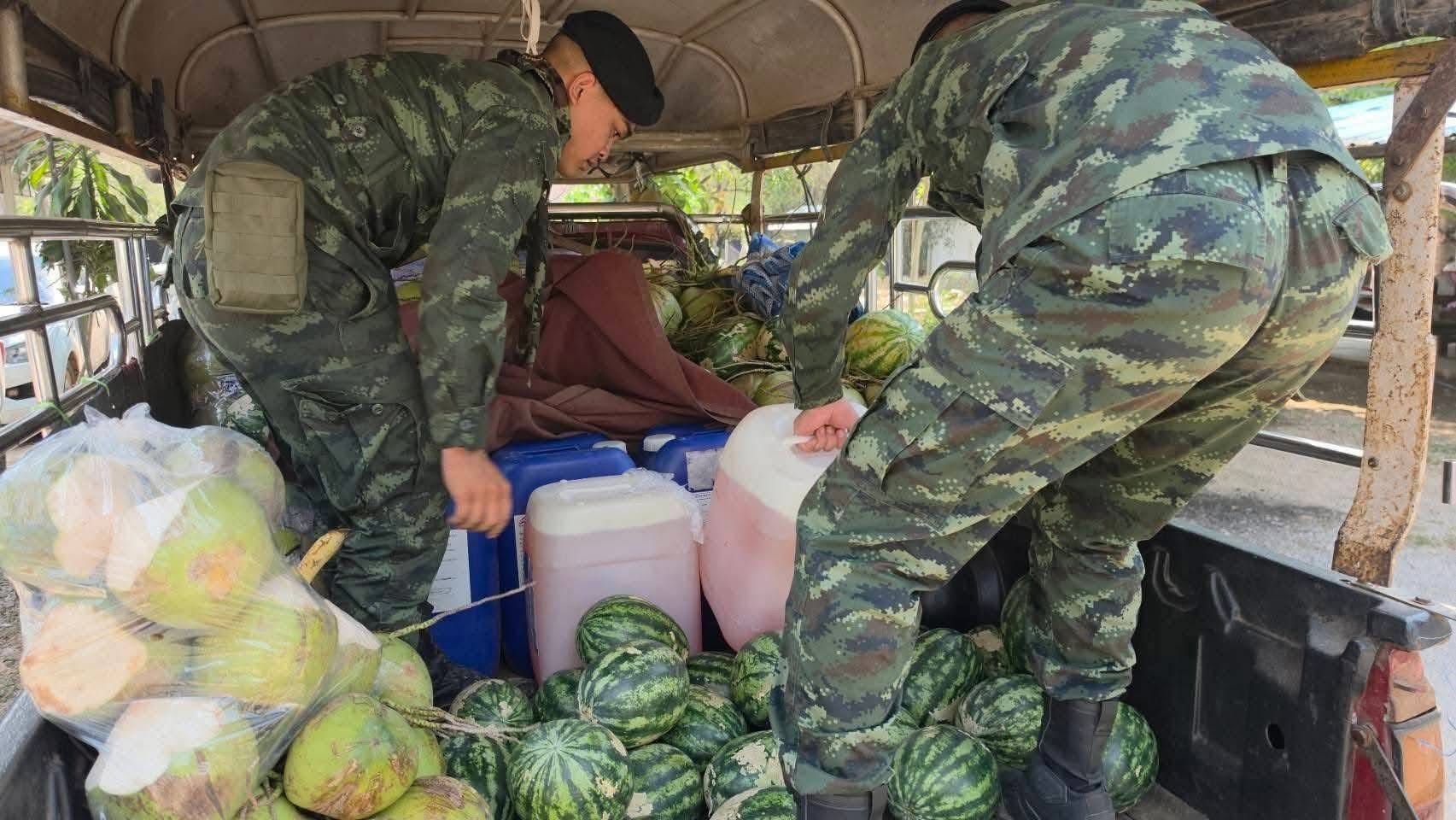 กาญจนบุรี ทหาร ฉก.ลาดหญ้าพร้อมผู้กำกับสันติ สนธิกำลังร่วมกัยหลายหน่วย รวบลุงวัย 56 ปี ซ่อนน้ำมันกว่า 400 ลิตร ซุกรถขนแตงโม ไปขายต่างประเทศตกละลิตร 70 บาท