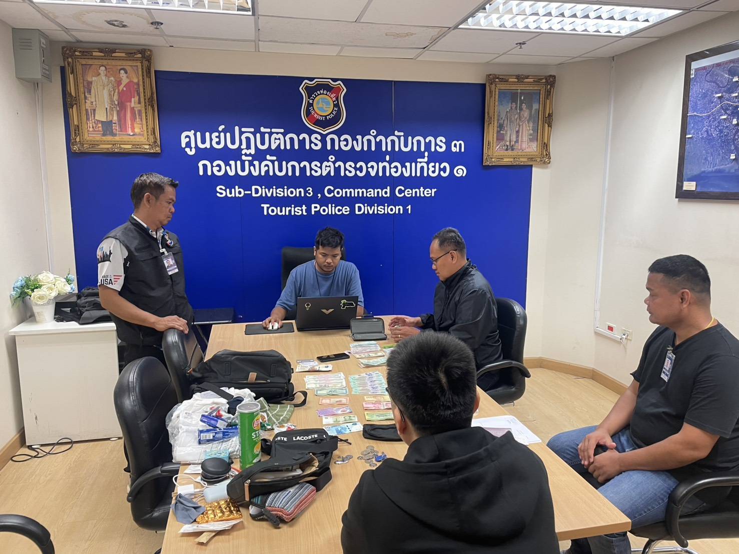 *****ภายใต้การอำนวยการสั่งการ พล.ต.ท.ศักย์ศิรา เผือกอ่ำ ผบช.ทท. พร้อมด้วย พล.ต.ต.พงษ์สยาม มีขันทอง รอง ผบช.ทท., พล.ต.ต.กฤษณ์ วาฤทธิ์ รอง ผบช.ทท., พล.ต.ต.ม.ล.สันธิกร วรวรรณ รอง ผบช.ทท., พล.ต.ต.ดนุ กล่ำสุ่ม ผบก.ทท.1, พ.ต.อ.ศราวุธ ตันกุล รอง ผบก.ทท.1, พ.ต.อ.ปิยรัช สุภารัตน์ รอง ผบก.ทท.1, พ.ต.อ.มนพร ลิขิตมานนท์ ผกก.3 บก.ทท.1, พ.ต.ท.อภิรุ่ง เพียรมงคล และ พ.ต.ท.เสกสันติ์ ฐิรเรืองรัตน์ สว.กก.3 บก.ทท.1 แถลงผลการปฏิบัติงาน“ตำรวจท่องเที่ยว กก.3 บก.ทท.1 จับกุมคนร้ายก่อเหตุลักทรัพย์นักท่องเที่ยวจีนบนเครื่องบิน”