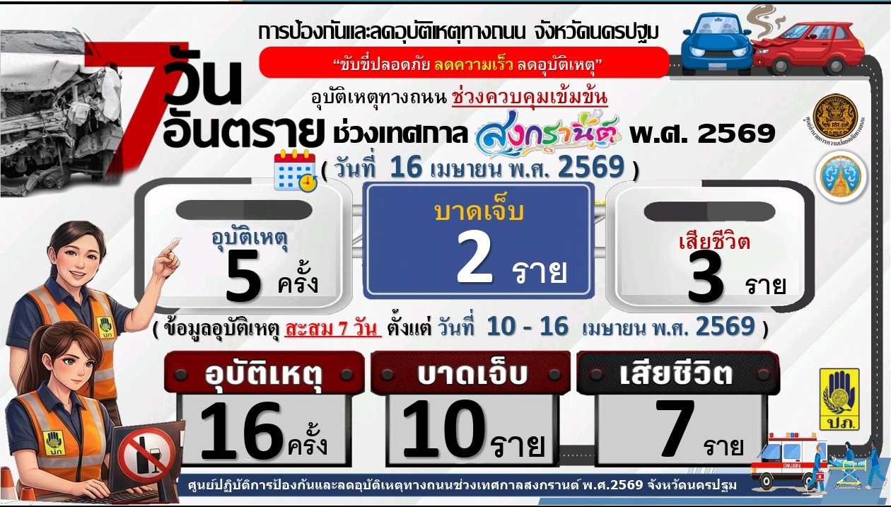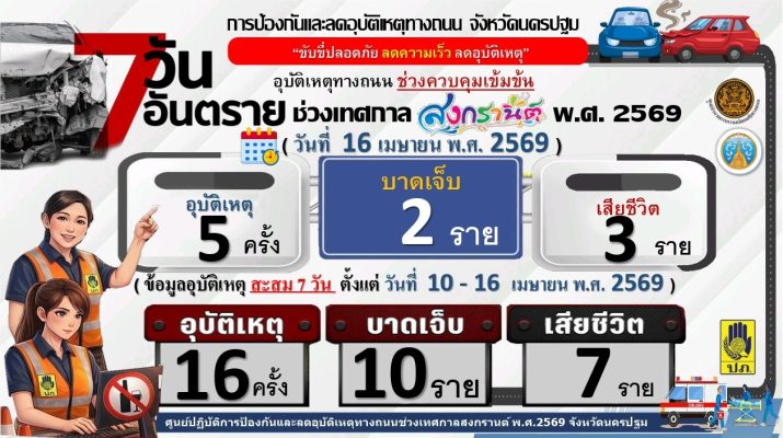 นครปฐม สรุปผลการรณรงค์ขับขี่ปลอดภัย ลดความเร็ว ลดอุบัติเหตุ ช่วงเทศกาลสงกรานต์ ประจำปี 2569 ในช่วง 7 วันที่ผ่านมา เกิดอุบัติเหตุรวม 16 ครั้ง มีผู้บาดเจ็บ 10 ราย และเสียชีวิต 7 ราย