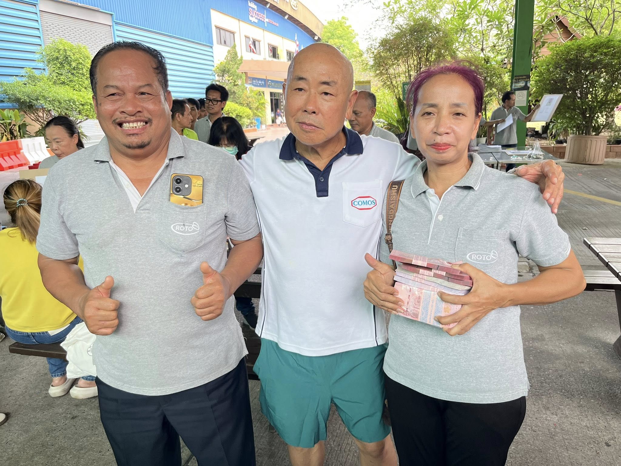 ซึ่งขณะนี้ทางบริษัทได้ทยอยจ่ายเงินให้พนักงานลูกจ้างไปแล้ว กว่า 300 คน ตามกฎระเบียบการดูแลลูกจ้างของกฎหมายแรงงาน อีกทั้ง ในวันนี้ตนเองยังได้สั่งอาหาร อาทิเช่น ไก่กรอบป้าแก้ว ข้าวเหนียว ลาบ น้ำตก ส้มตำ และไอศครีม เพื่อเป็นการเลี้ยงส่งพนักงานลูกจ้าง และจะทยอยจ่ายเงินให้พนักงานในส่วนที่ยังตกค้างอยู่ให้ครบเสร็จสิ้น และในส่วนพนักงานบางคนหรือบางกลุ่มที่ใจร้อนและได้ใช้คำพูดถ้อยคำใส่ร้ายหรือคิดไม่ดีกับตนเองก็ขออโหสิกรรมให้ทั้งหมดและไม่ถือโทษเอาความแต่อย่างใด อีกทั้ง ในวันนี้ทางบริษัทโคมอสได้มอบอุปกรณ์ ประเภท แบร์ริเออร์ กรวยพลาสติก และเสื้อผ้าแบรนด์เนม มอบให้กับทางมูลนิธิร่วมกุศลสมุทรปราการ เพื่อนำไปใช้ให้เกิดประโยชน์แก่สังคมอย่างสูงสุดต่อไป และในส่วนประเภทเหล็กโครงสร้างที่ไม่ได้ใช้จากการปิดกิจการลง ทางบริษัทก็จะนำไปขายทอดตลาดเป็นเศษเหล็กเพื่อนำเงินมาจ่ายเยียวยาให้แก่พนักงานที่ยังไม่ได้รับเงินเยียวยาต่อไปโดยมี นางสาวศาตพร ภูมิโคกทรัพย์ ผู้จัดการมูลนิธิร่วมกุศล สมุทรปราการ และเจ้าหน้าที่มูลนิธิร่วมกุศล สมุทรปราการ ร่วมกันรับมอบ