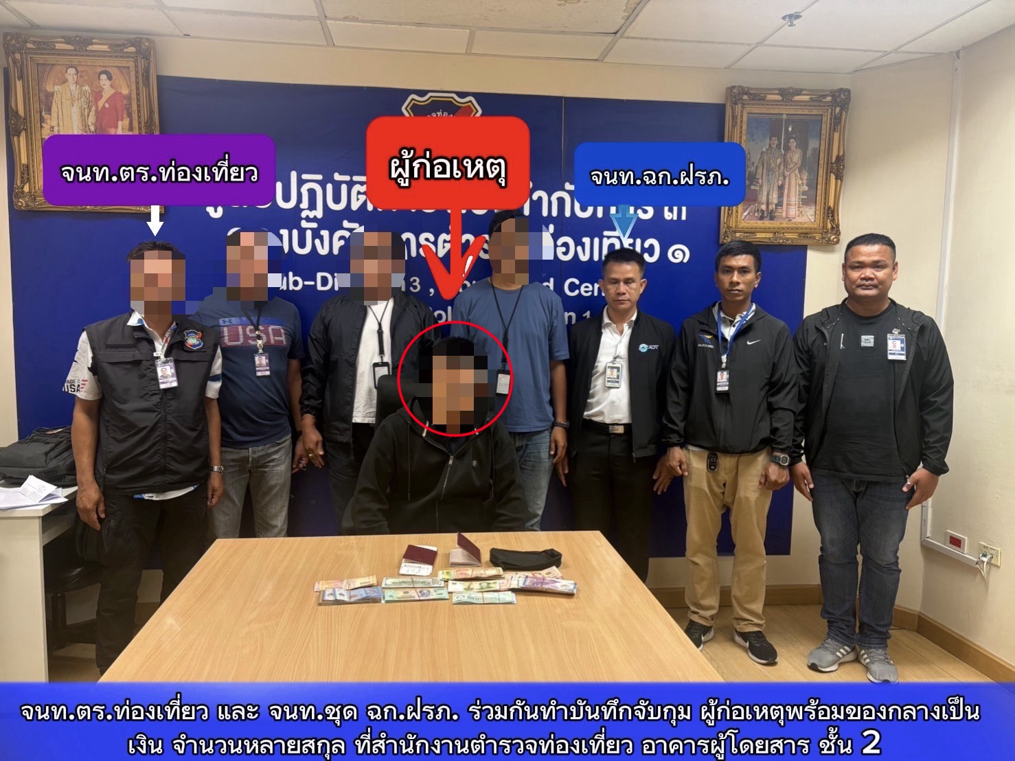 *****ทั้งนี้ภายหลังได้รับแจ้งเหตุดังกล่าว ศูนย์รักษาความปลอดภัยท่าอากาศยานสุวรรณภูมิ จึงได้ประสานเจ้าหน้าที่ชุดเฉพาะกิจฝ่ายรักษาความปลอดภัย ทสภ. (ฉก.ฝรภ.ทสภ.) และสถานีตำรวจภูธรท่าอากาศยานสุวรรณภูมิ (สภ.ทสภ.) พร้อมด้วยกองกำกับการ 3 กองบังคับการตำรวจท่องเที่ยว 1 เข้าพื้นที่บริเวณหน้า Gate C6 เพื่อเข้าตรวจสอบเหตุการณ์ดังกล่าวทันทีเมื่ออากาศยานเดินทางถึง ทสภ. กระทั่งพบบุคคลต้องสงสัย จึงได้แสดงตัวเข้าทำการตรวจค้นและควบคุมตัว จากการตรวจค้นพบเงินสดจำนวน 16,020 บาท ซุกซ่อนอยู่ภายในกระเป๋าคาดอกสีดำของผู้ต้องสงสัย ซึ่งเป็นชายสัญชาติจีน อายุ 41 ปี ซึ่งโดยสารมากับเที่ยวบินเดียวกัน โดยผู้ต้องสงสัยให้การรับสารภาพว่าเป็นผู้ก่อเหตุจริง เจ้าหน้าที่จึงได้ควบคุมตัวส่งพนักงานสอบสวน สภ.ทสภ. เพื่อดำเนินคดีตามกฎหมายต่อไป