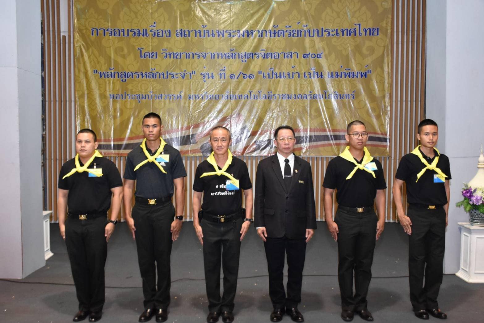 โดยมีรศ.ดร.อุดมวิทย์ ไชยสกุลเกียรติ รองอธิบดีมหาวิทยาลัยเทคโนโลยีราชมงคลรัตนโกสินทร์ ตำบลศาลายา อำเภอพุทธมณฑล จังหวัดนครปฐม เป็นประธาน นำคณะนักศึกษามหาวิทยาลัยเทคโนโลยีราชมงคลรัตนโกสินทร์ เข้ารับการฝึกหลักสูตรจิตอาสา904 “ หลักสูตรหลักประจำ” รุ่นที่1/61 “เป็นเบ้าเป็นแม่พิมพ์”