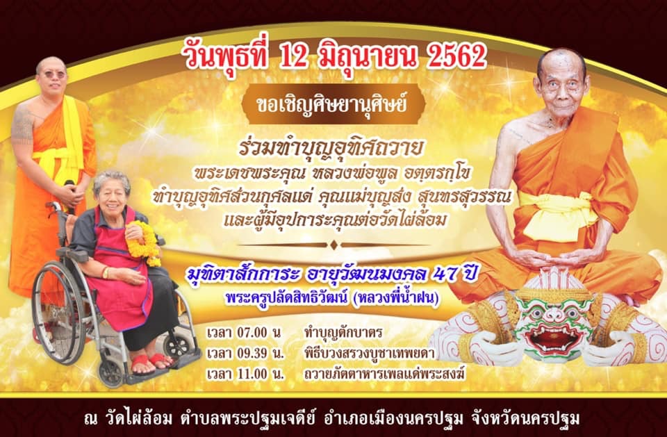 นครปฐม ขอเชิญศิษย์ยานุศิษย์วัดไผ่ล้อมร่วมพิธีทำบุญมุทิตาสักการะอายุวัฒนมงคลหลวงพี่น้ำฝน