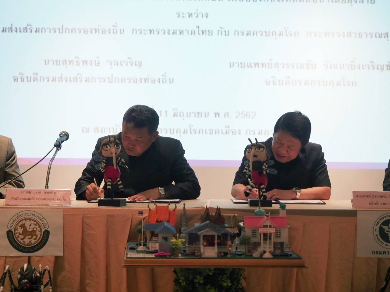 เมื่อวันที่ 11 มิถุนายน 2562 เวลา 16.00 น. ณ สถาบันป้องกันควบคุมโรคเขตเมือง กรมควบคุมโรค นายสุทธิพงษ์ จุลเจริญ อธิบดีกรมส่งเสริมการปกครองท้องถิ่น และนายแพทย์สุวรรณชัย วัฒนายิ่งเจริญชัย อธิบดีกรมควบคุมโรค ร่วมลงนามบันทึกข้อตกลงความร่วมมือ MOU การจัดการสิ่งแวดล้อม เพื่อป้องกันโรคติดต่อนําโดยยุงลาย ระยะเวลา 5 ปี
