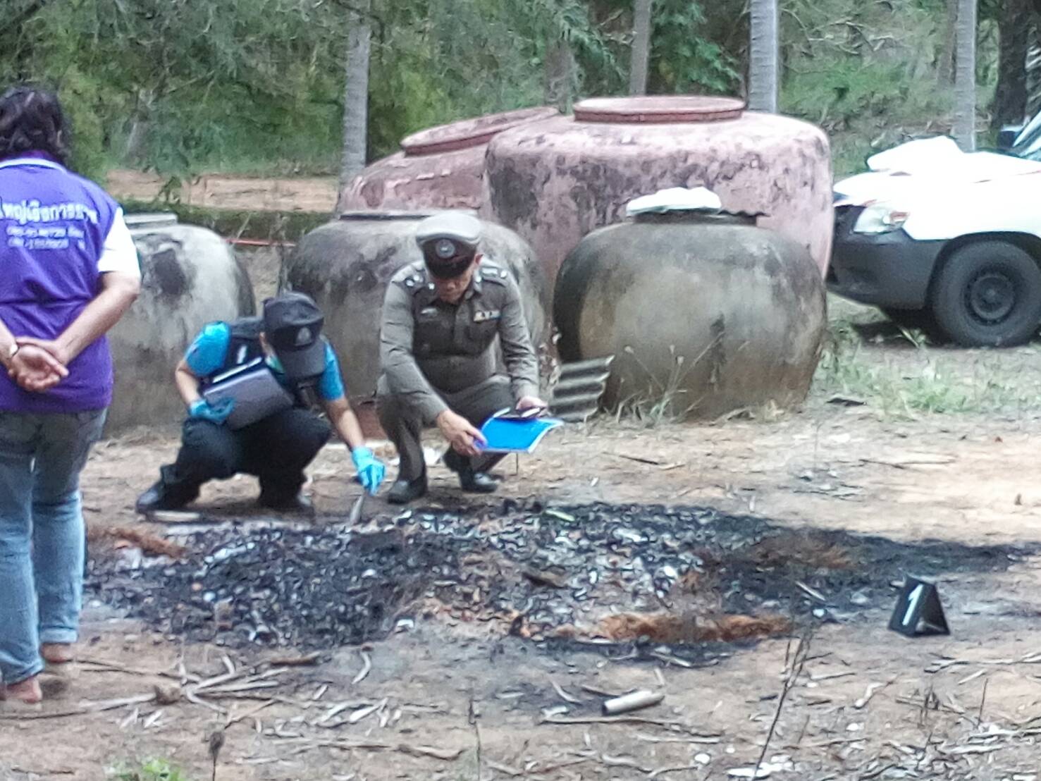 เมื่อเวลา 09.00 น.วันที่ 11 มิ.ย. 62 ร.ต.อ.วินัย รายละเอียด ร้อยเวรสอบสวน สภ.ทับสะแก จังหวัดประจวบคีรีขันธ์ ได้รับแจ้งจาก น.ส.ปราณี รอดไข อายุ 63 ปี บ้านเลขที่ 12/7 ซอยวัดถ้ำอัศจรรย์ หมู่ที่ 2 ตำบลอ่างทอง อำเภอทับสะแก ว่าพบเศษเถ้ากองกระดูกน่าจะเป็นมนุษย์ ถูกไฟเผาไหม้เป็นกองที่บริเวณหน้าบ้าน จึงรายงานให้ผู้บังคับบัญชาทราบตามลำดับชั้น จากนั้นจึงพร้อมด้วย พ.ต.อ.อดุลชัย เผ่าพันธุ์ศร ผกก.สภ.ทับสะแก พ.ต.ท.ทัศจักร ลีลาโรจนกุลเลิศ รอง ผกก.สอบสวน พ.ต.ท.วศพล เรืองจ้อย รอง ผกก.สืบสวน พร้อมชุดสืบสวน เจ้าหน้าที่ตำรวจพิสูจน์หลักฐาน ภ.จว.ประจวบคีรีขันธ์ แพทย์เวร รพ.ทับสะแก และมูลนิธิสว่างรุ่งเรือง รุดไปตรวจสอบที่เกิดเหตุ