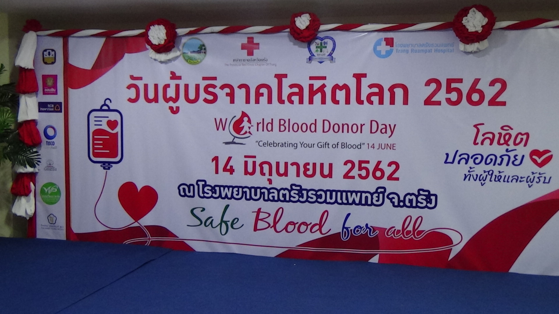 เหล่ากาชาดจังหวัดตรัง จัดกิจกรรมวันผู้บริจาคโลหิตโลก 2562 (World Blood Donor Day 2019) โดยมีนักเรียนนักศึกษา ประชาชน เข้าร่วมบริจาคโลหิตจำนวนมาก โดยมีเป้าหมายการรับบริจาคโลหิตไม่ต่ำกว่า 300 ยูนิต