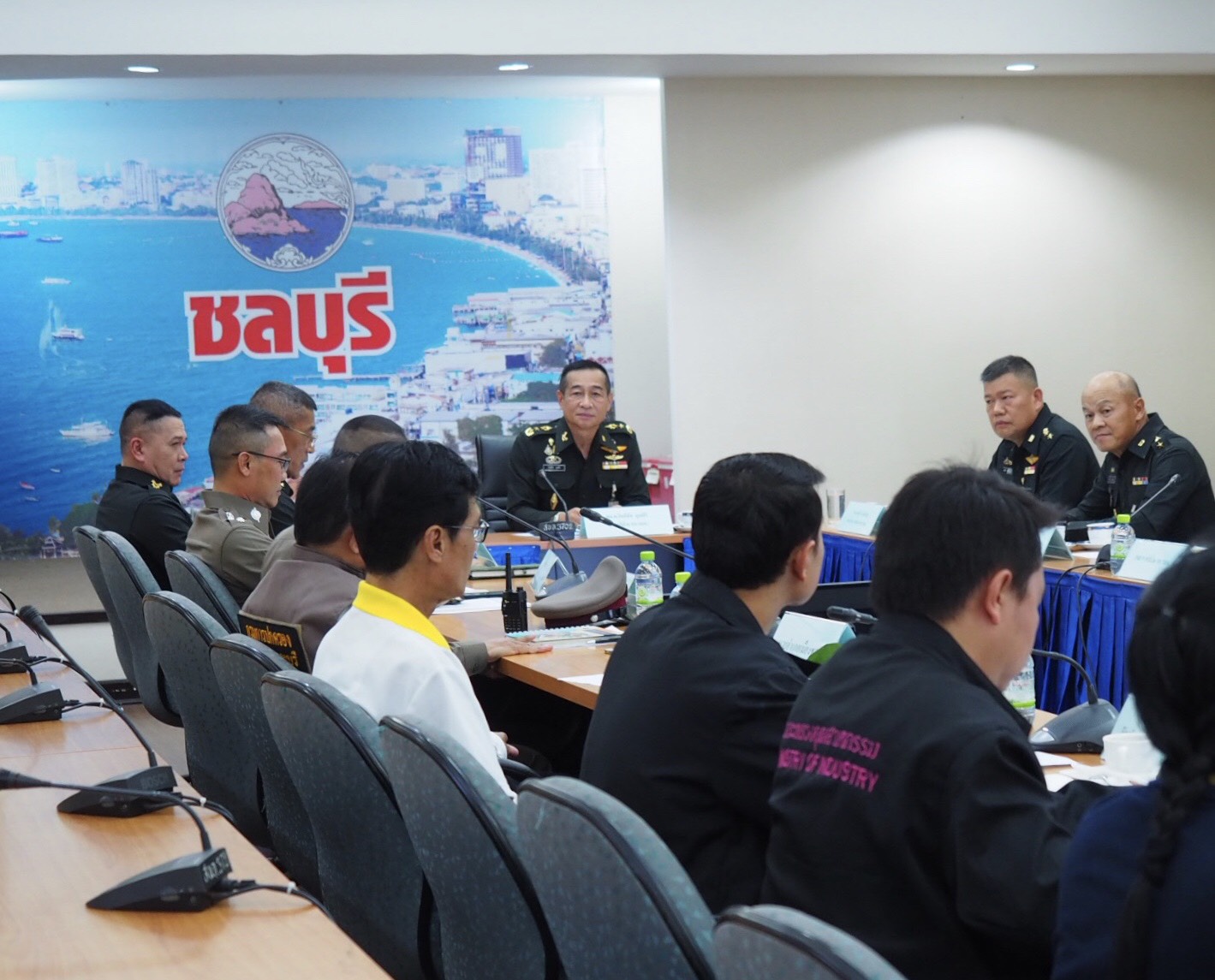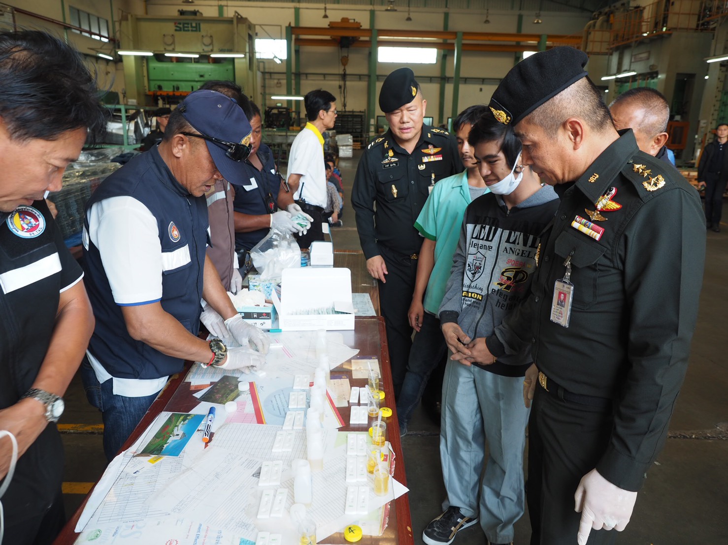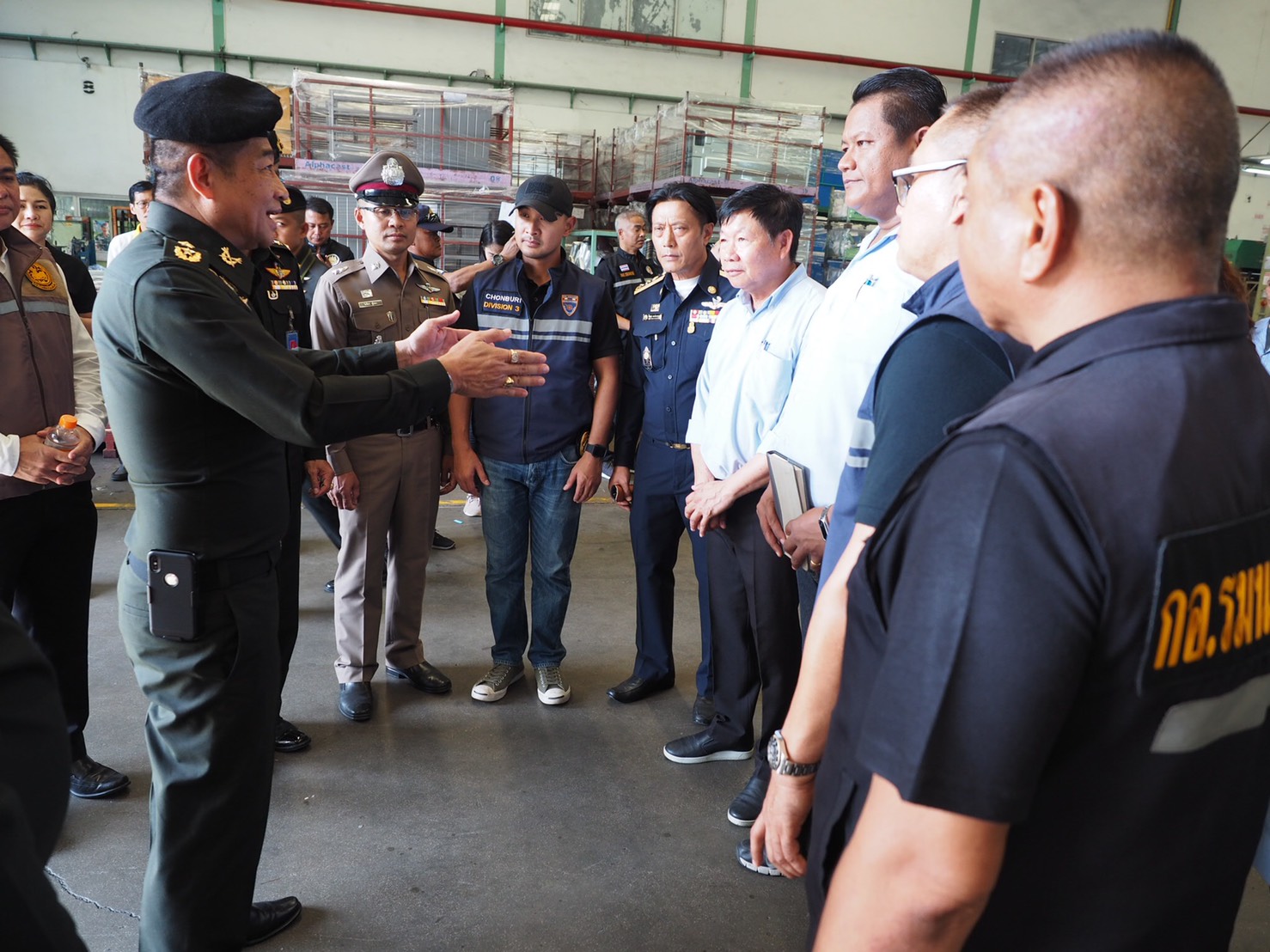 วันนี้ 14มิ.ย.62 ศูนย์ประสานการปฏิบัติที่ 2 กอ.รมน. ได้ลงพื้นที่จังหวัดชลบุรี เพื่อขับเคลื่อนโครงการตรวจสอบแรงงานต่างด้าวลักลอบทำงานโดยผิดกฏหมายและการป้องกันและแก้ไขปัญหายาเสพติด โดยมีนายภัครธรณ์ เทียนไชย ผู้ว่าราชการจังหวัดชลบุรี ให้การต้อนรับและร่วมหารือแนวทางการแก้ไขปัญหาแรงงานต่างด้าวและปัญหายาเสพติด การค้ามนุษย์ ตลอดจนการจัดระเบียบสังคม หลังจากนั้นได้เข้ารับฟังการบรรยายสรุปผลการปฏิบัติงานของส่วนราชการต่าง ๆ ในพื้นที่ รวมทั้งรับทราบปัญหาข้อขัดข้องและข้อเสนอแนะในการปฏิบัติงานของหน่วยงานที่เกี่ยวข้อง ภายหลังเสร็จสิ้นการบรรยายสรุป พล.ท.กิตติธัช บุพศิริ ผู้อำนวยการศูนย์ประสานการปฏิบัติที่ 2 กอ.รมน. และเจ้าหน้าที่ทีมสหวิชาชีพของจังหวัดชลบุรีได้เดินทางไปตรวจสอบการจ้างแรงงานต่างด้าวในสถานประกอบการแห่งหนึ่งในพื้นที่จังหวัดชลบุรี รวมทั้งมีการสุ่มตรวจปัสสาวะแรงงานต่างด้าวเพื่อหาสารเสพติด