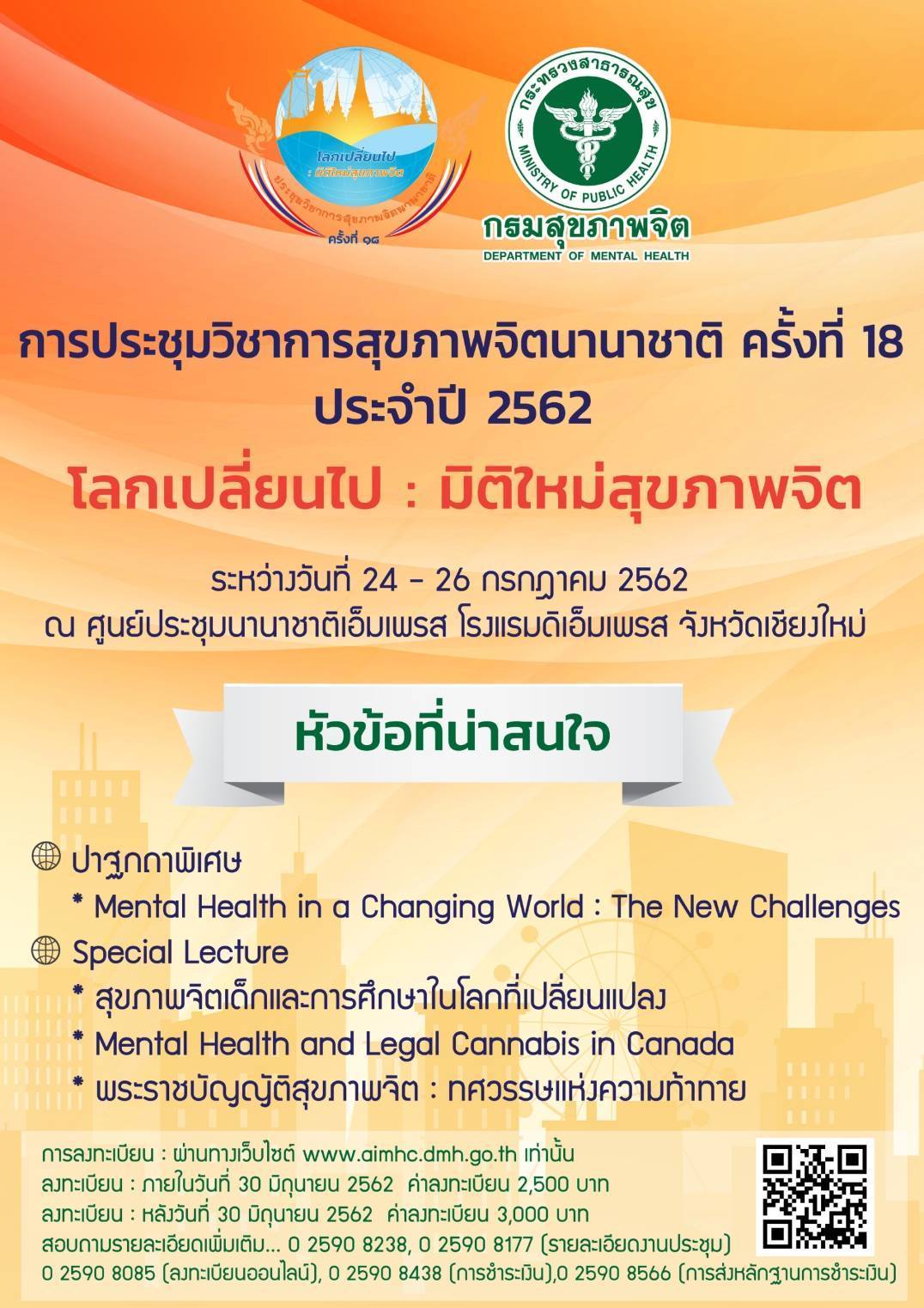 การประชุมวิชาการสุขภาพจิตนานาชาติครั้งที่ 18 ประจำปี 2562 โลกเปลี่ยนไปในสุขภาพจิตระหว่างวันที่ 24 ถึง 26 กรกฎาคม 2562 ณศูนย์ประชุมนานาชาติเอ็มเพรสโรงแรมดิเอ็มเพรส จังหวัดเชียงใหม่. หัวข้อที่น่าสนใจ