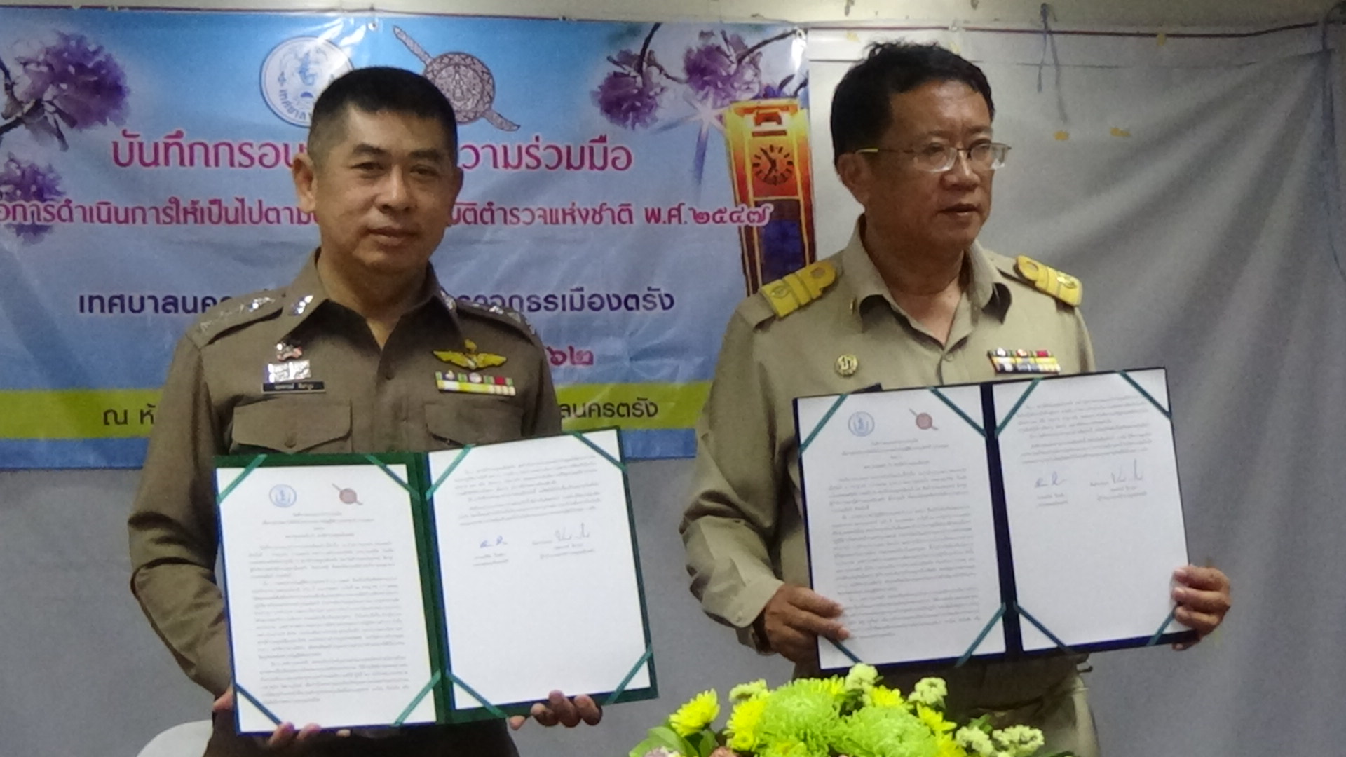 ที่อาคารอเนกประเทศเทศบาลนครตรัง จังหวัดตรัง นายอภิชิต วิโนทัย นายกเทศมนตรีนครตรัง และพ.ต.อ.อลงกรณ์ สีมาวุธ ผู้กำกับการสถานีตำรวจภูธรเมืองตรัง ร่วมลงนามบันทึกกรอบแนวคิดทางความร่วมมือ เพื่อการดำเนินการให้เป็นไปตามพระราชบัญญัติตำรวจแห่งชาติ พ.ศ.2547 เพื่อให้องค์กรปกครองส่วนท้องถิ่นและองค์กรภาคเอกชน เข้ามามีส่วนร่วมในการปฏิบัติภารกิจของสำนักงานตำรวจแห่งชาติ