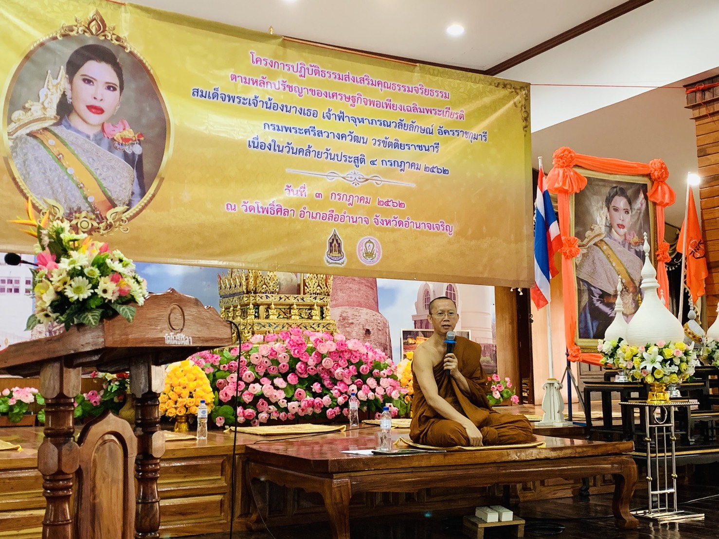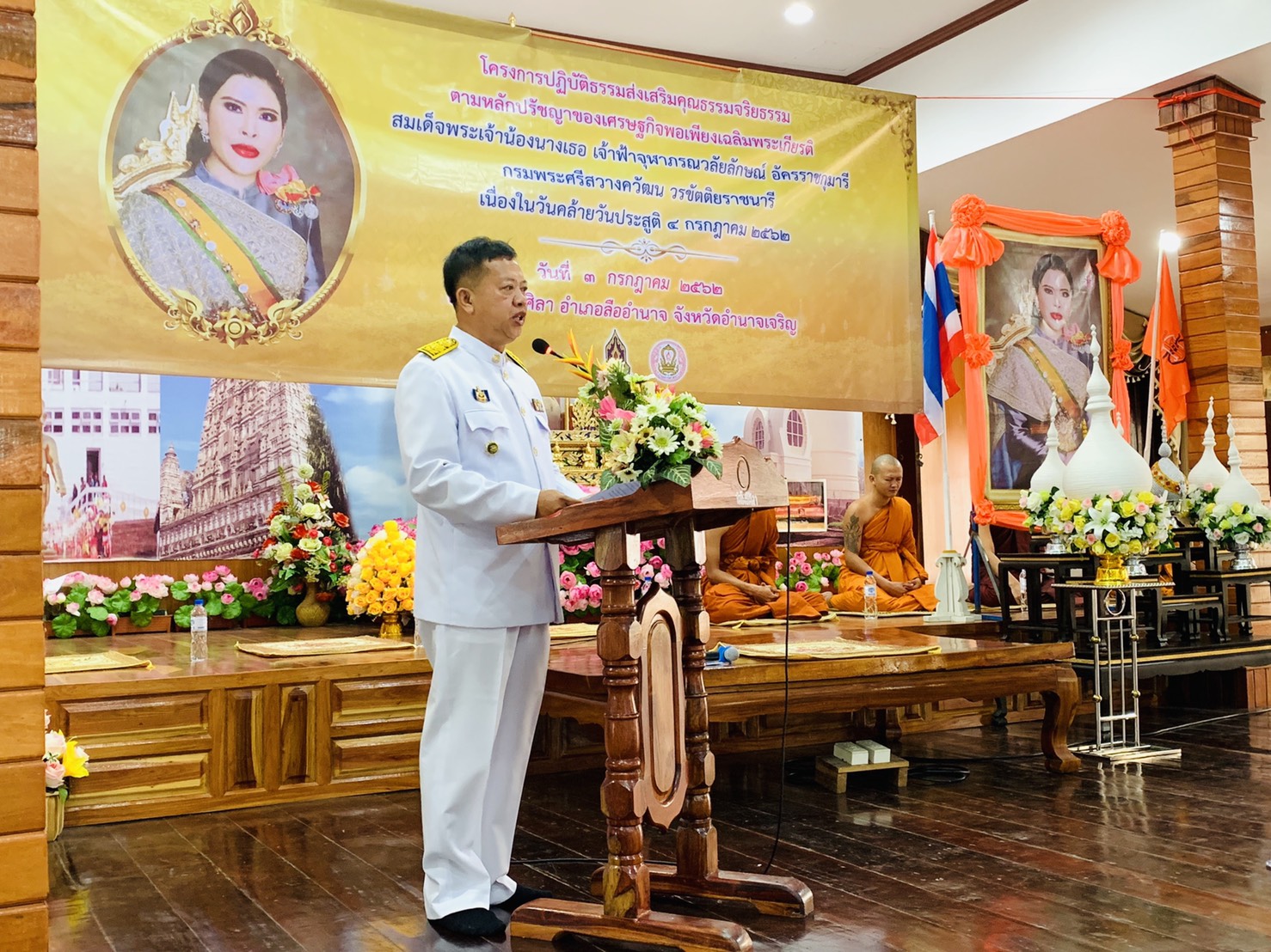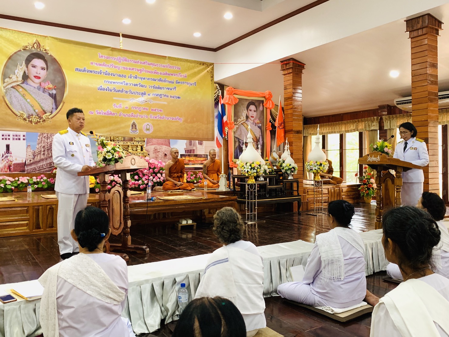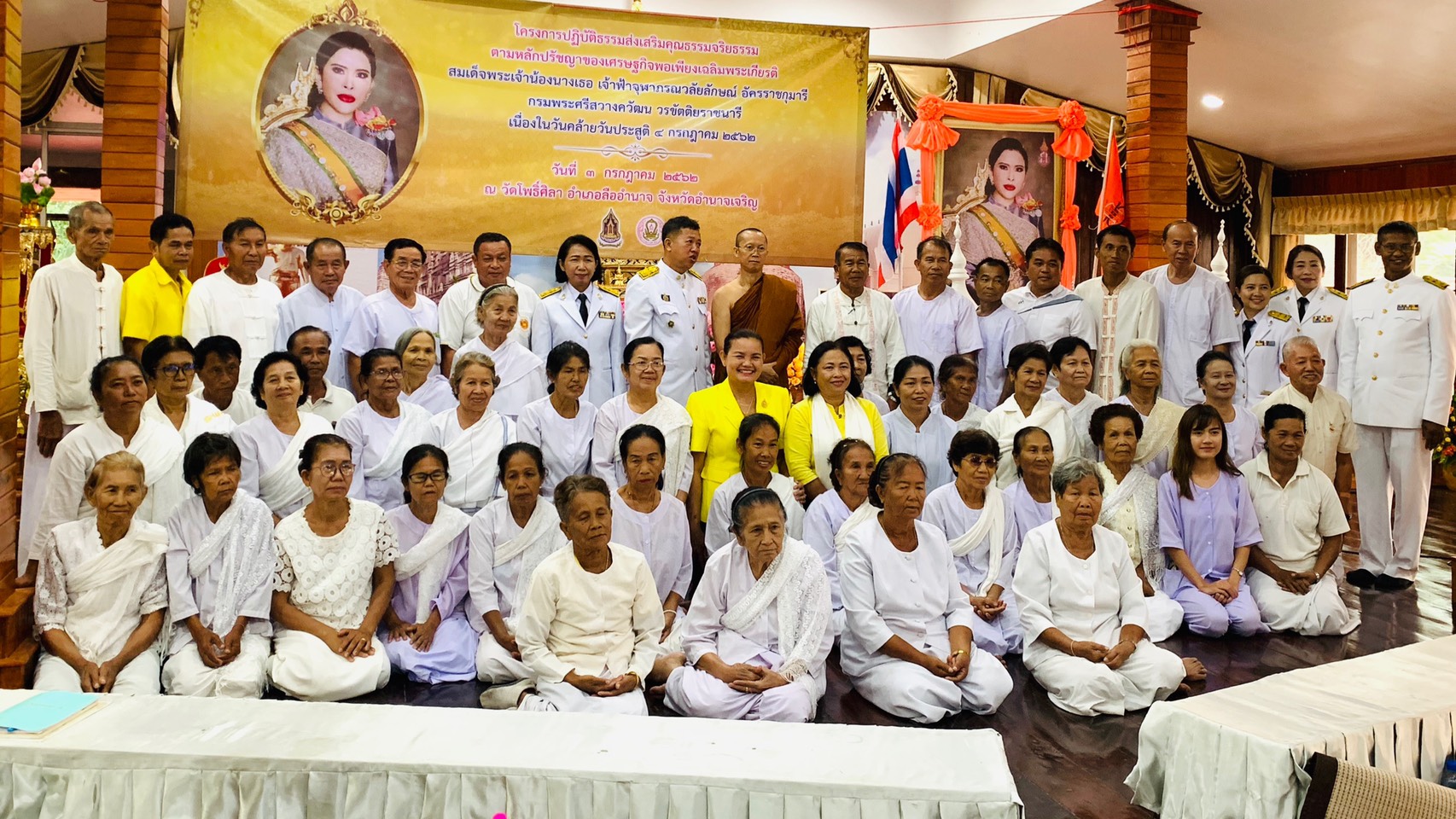 นายธนูศักดิ์ เสมอภาค นายอำเภอลืออำนาจ จังหวัดอำนาจเจริญ เป็นประธานเปิด “โครงการปฏิบัติธรรมส่งเสริมคุณธรรมจริยธรรมตามแนวผลัดปรัชญาเศรษฐกิจพอเพียงเฉลิมพระเกียรติสมเด็จพระเจ้าน้องนางเธอ เจ้าฟ้าจุฬาภรณวลัยลักษณ์ อัครราชกุมารี กรมพระศรีสวางควัฒน วรขัตติยราชนารี เนื่องในวโรกาสวันประสูติ 4 กรกฎาคม 2562 วันโพธิ์ศิลา ต.เปือย อ.ลืออำนาจ จ.อำนาจเจริญ มีผู้เข้าอบรม จำนวน 75 คน