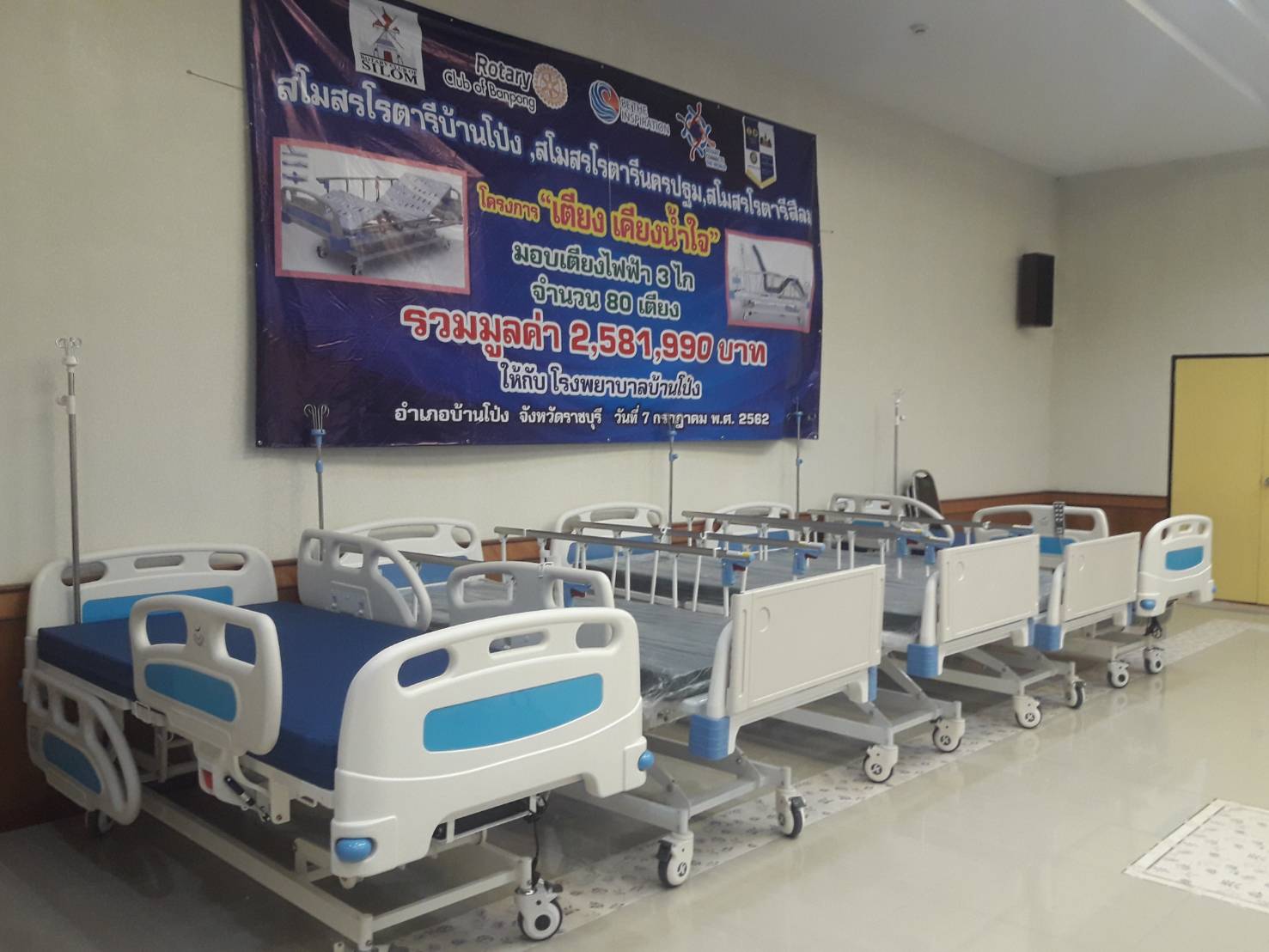 โดยวันนี้ได้มีพิธีส่งมอบเตียงไฟฟ้า3 ไก จำนวน 80 เตียง และเครื่องมือแพทย์ อีก 5 รายการ โดยมีนายแพทย์ธิติ แสวงธรรม ผู้อำนวยการโรงพยาบาลบ้านโป่ง เป็นผู้รับมอบ ได้แก่เครื่องดมยาสลบ เครื่องช่วยหายใจ เครื่องบันทึกการบีบตัวของมดลูกและการทำงานของทารกแฝด เครื่องวัดความดันลูกตาระบบมือถือ เครื่องช่วยหายใจ เครื่องล้างตัวกรองไตเทียม ให้กับโรงพยาบาลบ้านโป่งเพื่อใช้งานและให้บริการผู้ป่วย มูลค่า 6 ล้านกว่าบาท.