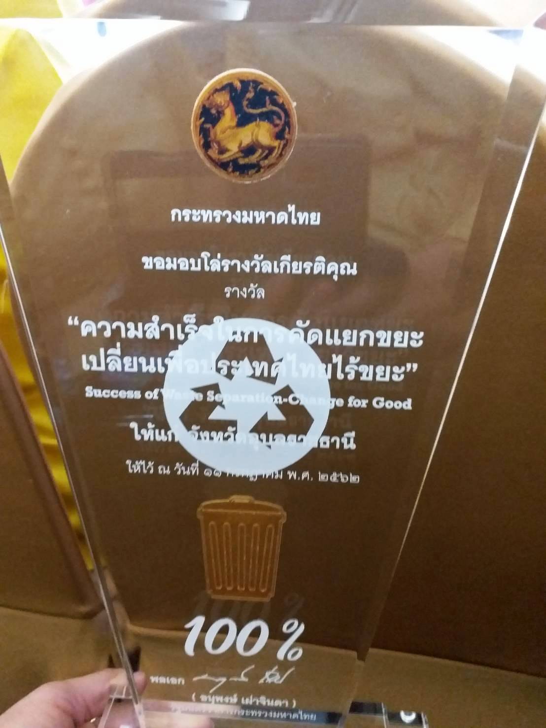 ผู้ว่าอุบลราชธานี รับรางวัลความสำเร็จในการแยกขยะเปลี่ยนเพื่อประเทศไทยไร้ขยะ ประจำปี 2562
