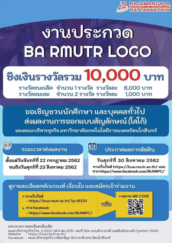 มทร.รัตนโกสินทร์ คณะบริหารธุรกิจบพิตรพิมุขจักรวรรดิขอเชิญชวนนักศึกษาและบุคคลทั่วไปร่วมงานประกวดBA RMUTR LOGO ชิงเงินรางวัลรวม10,000 บาทรางวัลชนะเลิศจำนวน1รางวัลรางวัลละ8,000บาทรางวัลชมเชยจำนวน2รางวัลรางวัลละ1,000 บาท