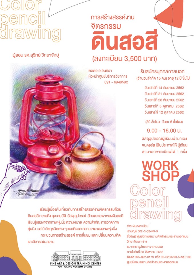 ศูนย์ฝึกอบรมงานศิลปกรรมและงานออกแบบ วิทยาลัยเพาะช่าง รับสมัครบุคคลทั่วไป การสร้างสรรค์งานจิตรกรรมดินสอสี ผู้เรียนได้เรียนรู้เบื้องต้นเกี่ยวกับเทคนิคการใช้สี ด้วยดินสอสี แลกเปลี่ยนและวิจารณ์งานจากอาจารย์ผู้สอน การลงน้ำหนักแสงเงา เรียนรู้แสงเงาจากหุ่นนิ่ง วัตถุต่างๆ กระบวนการสร้างสรรค์ผลงาน