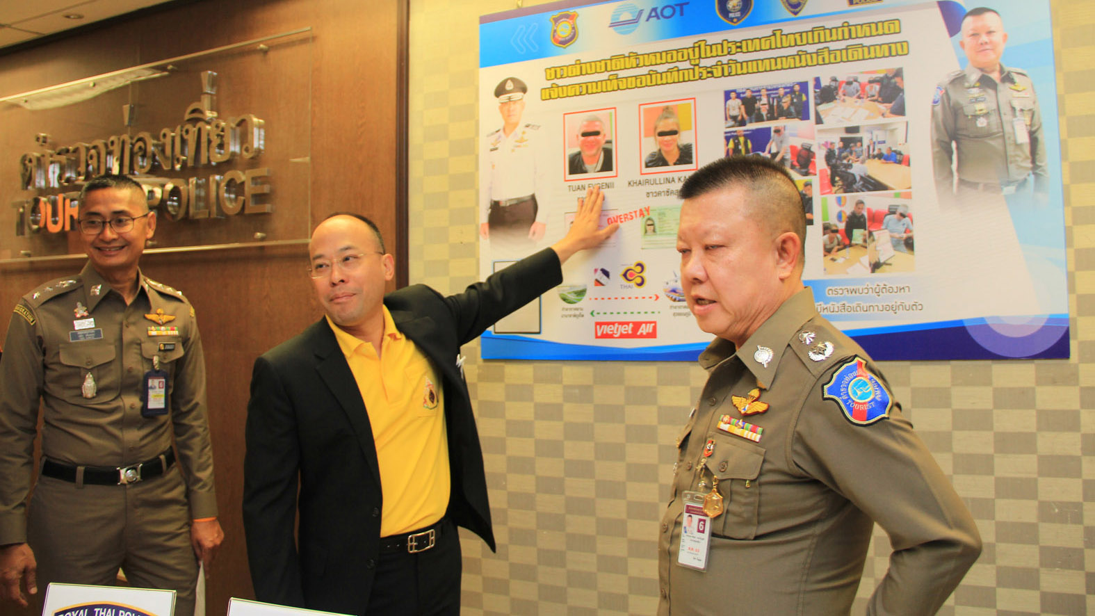 *****เมื่อเวลา 11.00 น. วันที่ 25 กรกฎาคม 2562 ที่กองบังคับการตำรวจท่องเที่ยวท่าอากาศยานสุวรรณภูมิ สมุทรปราการ พล.ต.ต.วรพงษ์ ทองไพบูลย์ ผบก.ทท.1 นายกิตติพงศ์ กิตติขจร รองผู้อำนวยการท่าอากาศยานสุวรรณภูมิ (สายปฏิบัติการ1 ) พ.ต.อ.ศารุติ แขวงโสภา รอง ผบก.ทท.1 พ.ต.อ.เพลิน กลิ่นพยอม ผกก.สส.ปป.บก.ตม.2 ได้ร่วมกันแถลงผลการจับกุมนายเยฟเกนี ตูราน (Mr. EVEENII TURAN) อายุ33ปี ชาวรัสเซียและ น.ส.คามิลเลีย ไครูลยีนา (Ms. KAMILYA KHAIRULLINA) อายุ 27ปี ชาวคาซัคสถาน สองผู้ต้องในคดี แจ้งความเท็จ โดยขอลงบันทึกประจำวันว่าลืมเอาหนังสือเดินทางมา เพื่อใช้เป็นหลักฐานในการอ้างกับสายการบินในการเดินออกนอกประเทศ