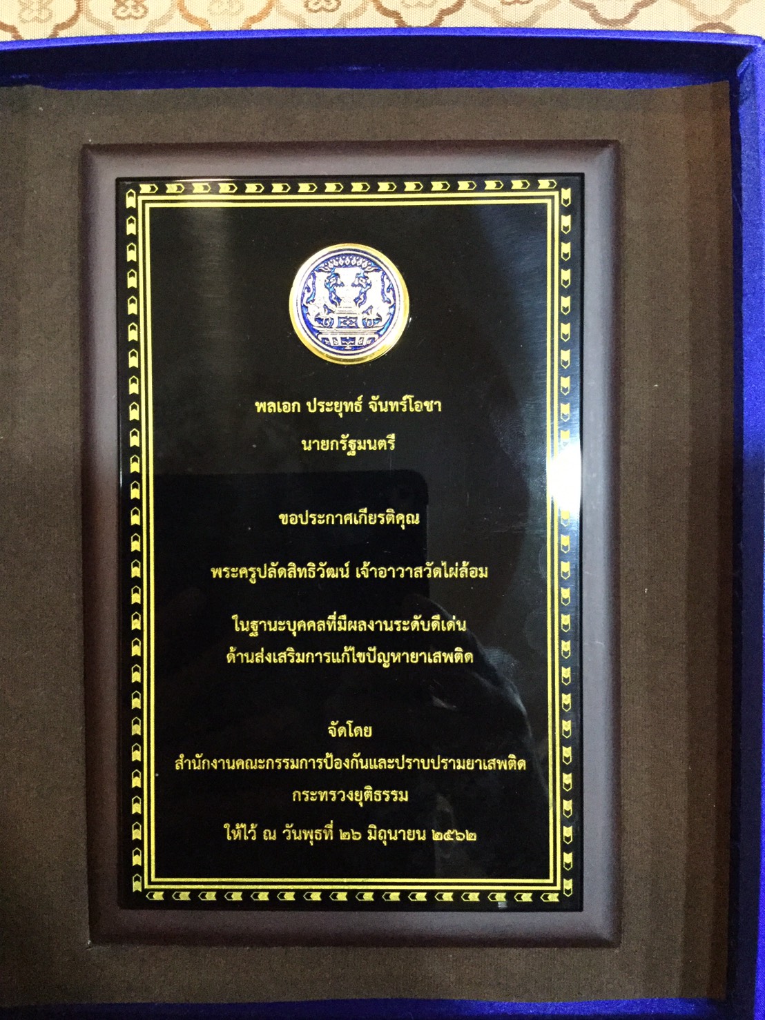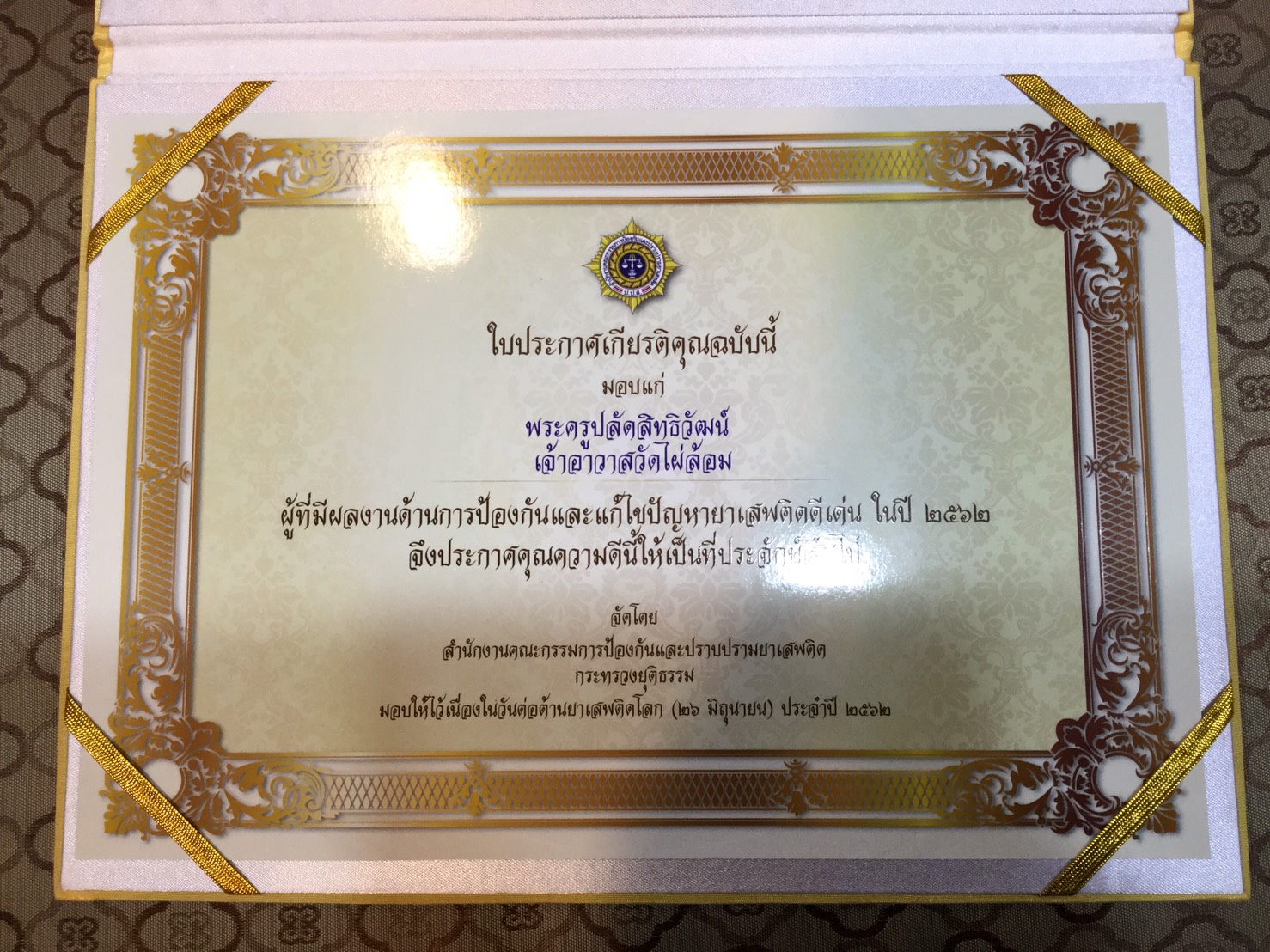 โดยมีเนื้อความในโล่ระบุไว้ดังนี้ “พลเอก ประยุทธ์ จันทร์โอชา นายกรัฐมนตรี ขอประกาศเกียรติคุณ พระครูปลัดสิทธิวัฒน์ เจ้าอาวาสวัดไผ่ล้อม ในฐานะบุคคลที่มีผลงานระดับดีเด่น ด้านส่งเสริมการแก้ไขปัญหายาเสพติด จัดโดย สำนักงานคณะกรรมการป้องกันและปราบปรามยาเสพติด กระทรวงยุติธรรม ให้ไว้ ณ วันพุธที่ 26 มิถุนายน 2562”