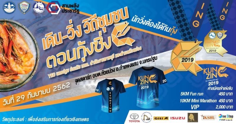 การท่องเที่ยวแห่งประเทศไทย (ททท.) สำนักงานราชบุรี ร่วมกับ YEC นครปฐม ท่องเที่ยวและกีฬาจังหวัด บริษัท ประชารัฐรักสามัคคีนครปฐม (วิสาหกิจเพื่อสังคม) จำกัด กำหนดจัดกิจกรรม “เดิน-วิ่ง วิถีชุมชน ตอนกุ้งซิ่ง (Kung Zing)” ในวันอาทิตย์ที่ 29 กันยายน 2562 เพื่อกระตุ้นให้เกิดการเดินทางท่องเที่ยวสู่จังหวัดนครปฐม ช่วง Green Season ภายใต้โครงการ “เยือนวิถีไทย วิถีเกษตรอินทรีย์”