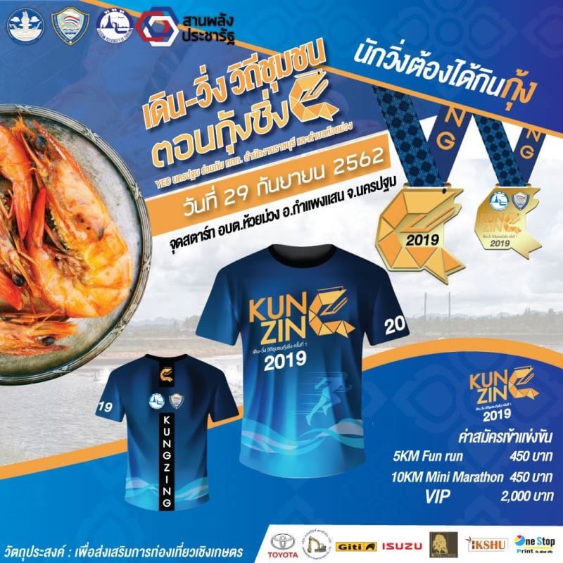 สำหรับกิจกรรม “เดิน-วิ่ง วิถีชุมชน ตอนกุ้งซิ่ง : Kung Zing ” แบ่งระยะทางการวิ่งออกเป็น 2 ระยะ ได้แก่ ระยะทาง 5 กิโลเมตร สำหรับนักท่องเที่ยวกลุ่ม Multi Gent Family และการแข่งขันระยะทาง 10 กิโลเมตร สำหรับนักวิ่งทั่วไป ซึ่งนักวิ่งจะได้สัมผัสบรรยากาศธรรมชาติสวยงามและได้รับประสบการณ์ท่องเที่ยวชุมชนแบบ Amazing ไทยเท่ วิ่งผ่านชุมชน ทุ่งนาและบ่อกุ้งก้ามกรามช่วงเช้าตรู่ ในเขตตำบลห้วยม่วง อำเภอกำแพงแสน ซึ่งเป็นแหล่งเลี้ยงกุ้งก้ามกราม ที่สำคัญแห่งหนึ่งของจังหวัดนครปฐม ได้เรียนรู้วิธีและเทคนิคการเลี้ยงกุ้ง การคัดแยกเพศกุ้ง ทดลองจับกุ้งตัวเป็นๆ ในบ่อกุ้งจำลอง ชิมเมนูเด็ดจากกุ้ง เช่น กุ้งเหยียด ข้าวต้มกุ้ง กุ้งแพชุบแป้งทอด เลือกซื้อสินค้า OTOP และของดีจากตำบลห้วยม่วง และนักวิ่งยังจะได้ซื้อกุ้งสดราคาสุดพิเศษซึ่งมีจำนวนจำกัดอีกด้วย